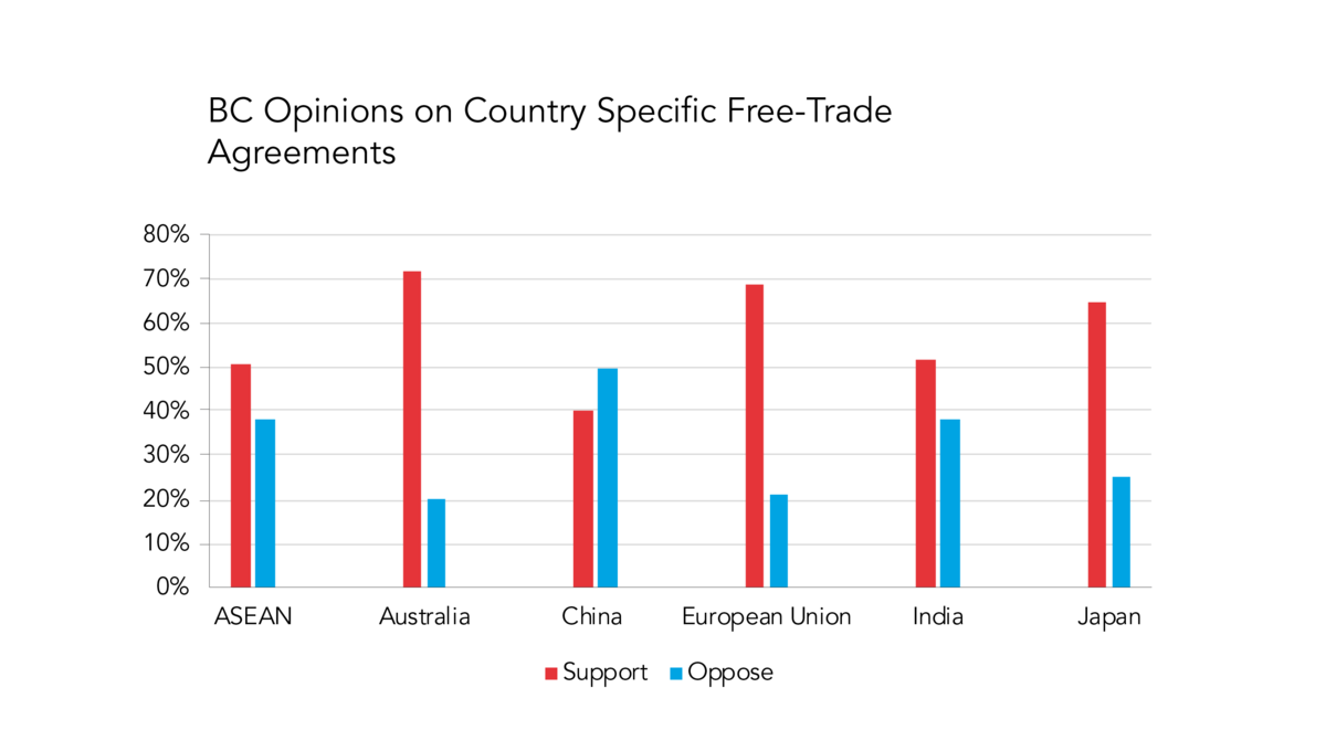 While the strength of the B.C.-India relationship is strong, it is especially clear when looking at opinions of free trade that B.C. has a gap to close in order to catch up with the rest of Canada. British Columbians are three per cent less likely than the rest of Canadians to support the Canadian Government entering a free trade agreement with India. They are more likely to support free trade with India than China or the Association of Southeast Asian Nations (ASEAN), but less likely than with Australia or Japan. On the whole, British Columbians are less likely to embrace free trade agreements with other countries than any of their Canadian counterparts. The Government of BC may need to address this issue in the near future, as current negotiations are taking place for a Comprehensive Economic Partnership Agreement (CEPA) between Canada and India.