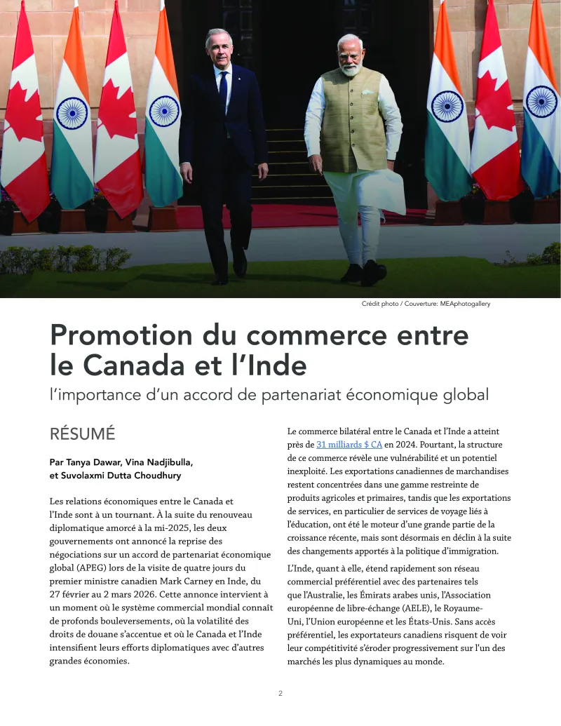 Les relations économiques entre le Canada et l’Inde sont à un tournant. À la suite du renouveau diplomatique amorcé à la mi-2025, les deux gouvernements ont annoncé la reprise des négociations sur un accord de partenariat économique global (APEG) lors de la visite de quatre jours du premier ministre canadien Mark Carney en Inde, du 27 février au 2 mars 2026. Cette annonce intervient à un moment où le système commercial mondial connaît de profonds bouleversements, où la volatilité des droits de douane s’accentue et où le Canada et l’Inde intensifient leurs efforts diplomatiques avec d’autres grandes économies.