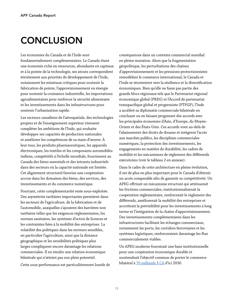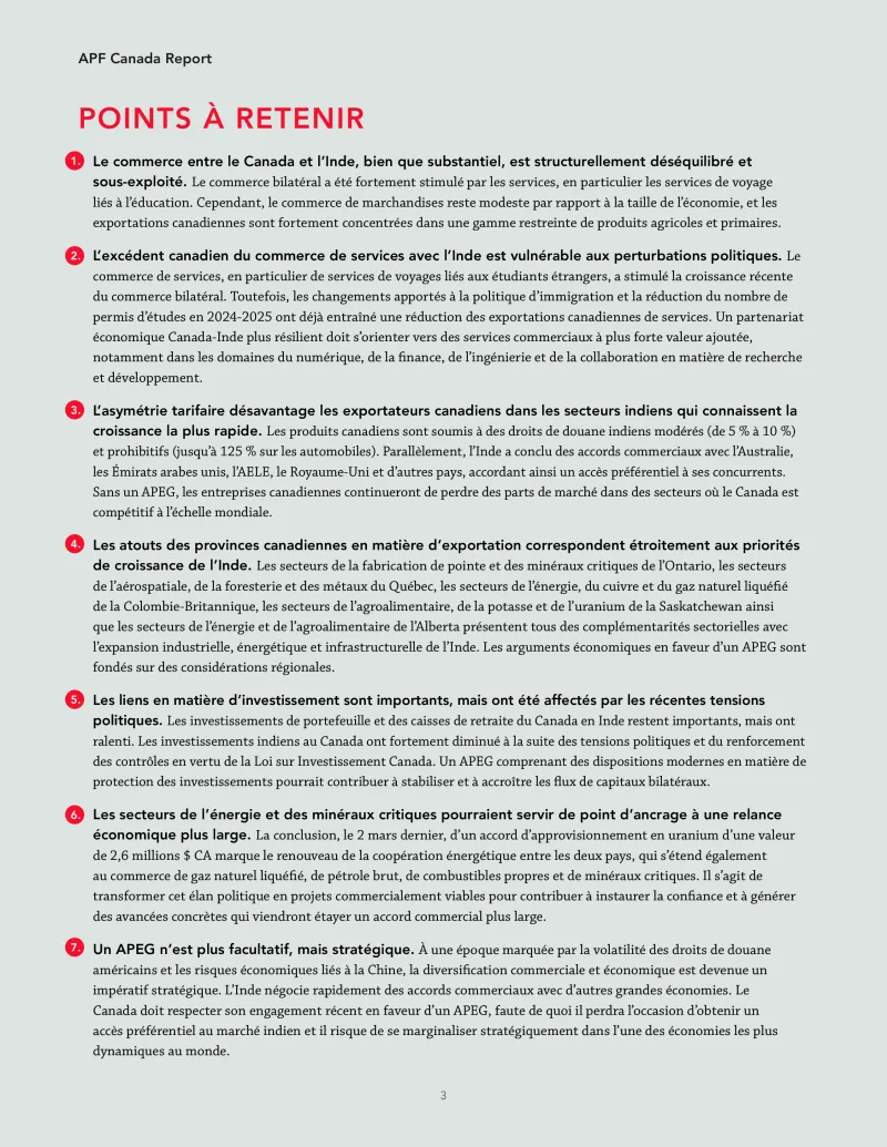 7. Un APEG n’est plus facultatif, mais stratégique. À une époque marquée par la volatilité des droits de douane américains et les risques économiques liés à la Chine, la diversification commerciale et économique est devenue un impératif stratégique. L’Inde négocie rapidement des accords commerciaux avec d’autres grandes économies. Le Canada doit respecter son engagement récent en faveur d’un APEG, faute de quoi il perdra l’occasion d’obtenir un accès préférentiel au marché indien et il risque de se marginaliser stratégiquement dans l’une des économies les plus dynamiques au monde.