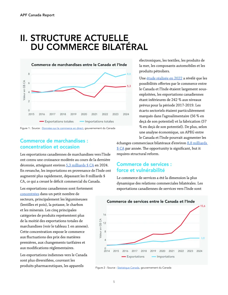 1. Le commerce entre le Canada et l’Inde, bien que substantiel, est structurellement déséquilibré et sous-exploité. Le commerce bilatéral a été fortement stimulé par les services, en particulier les services de voyage liés à l’éducation. Cependant, le commerce de marchandises reste modeste par rapport à la taille de l’économie, et les exportations canadiennes sont fortement concentrées dans une gamme restreinte de produits agricoles et primaires.