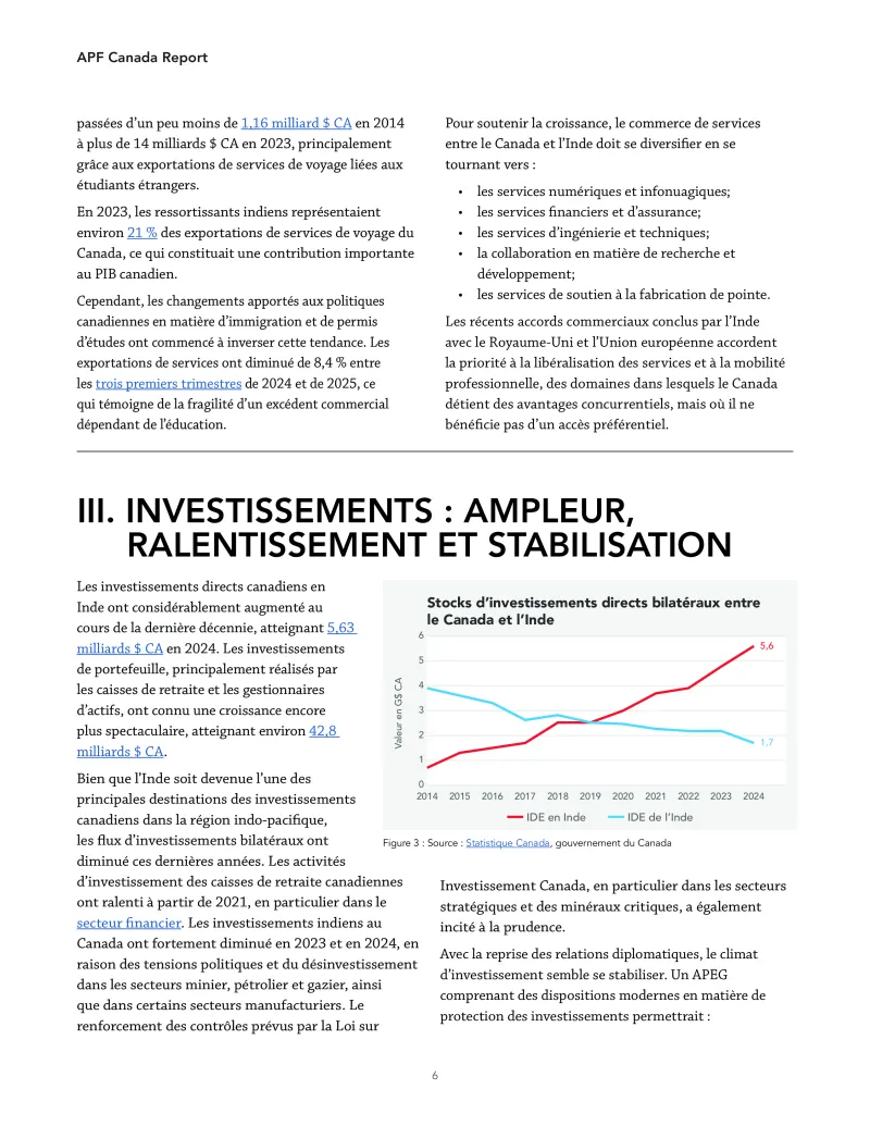 5. Les liens en matière d’investissement sont importants, mais ont été affectés par les récentes tensions politiques. Les investissements de portefeuille et des caisses de retraite du Canada en Inde restent importants, mais ont ralenti. Les investissements indiens au Canada ont fortement diminué à la suite des tensions politiques et du renforcement des contrôles en vertu de la Loi sur Investissement Canada. Un APEG comprenant des dispositions modernes en matière de protection des investissements pourrait contribuer à stabiliser et à accroître les flux de capitaux bilatéraux.