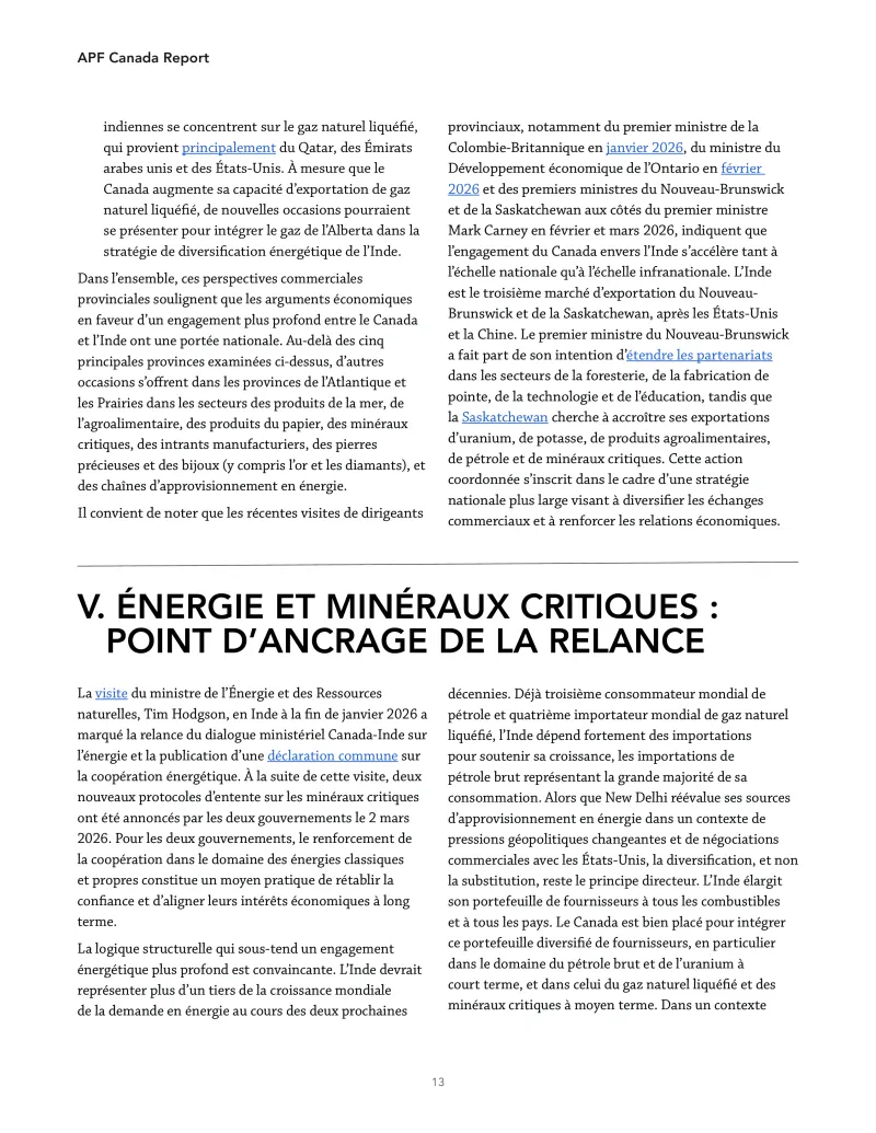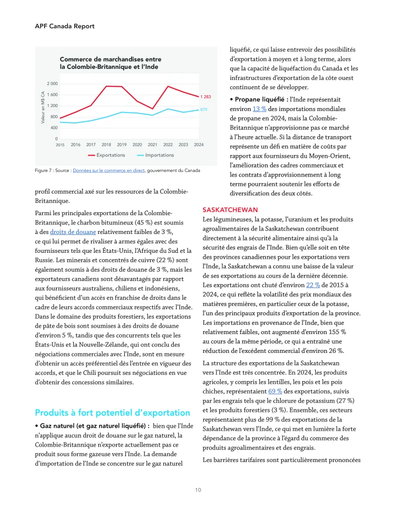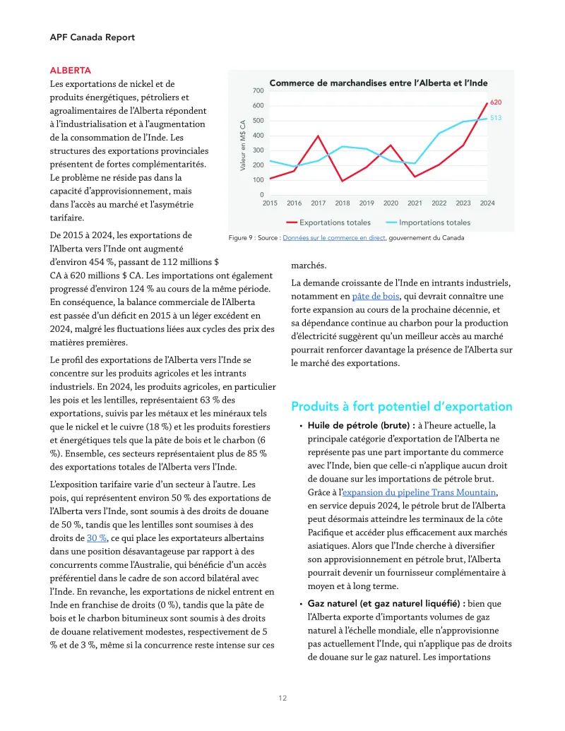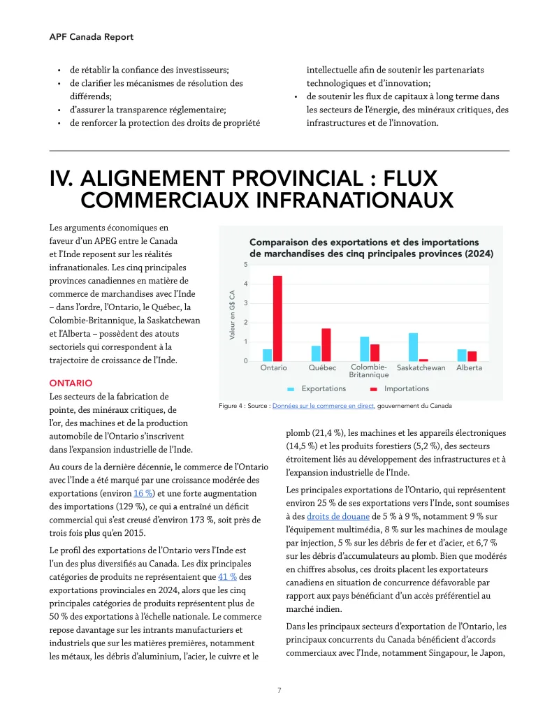 4. Les atouts des provinces canadiennes en matière d’exportation correspondent étroitement aux priorités de croissance de l’Inde. Les secteurs de la fabrication de pointe et des minéraux critiques de l’Ontario, les secteurs de l’aérospatiale, de la foresterie et des métaux du Québec, les secteurs de l’énergie, du cuivre et du gaz naturel liquéfié de la Colombie-Britannique, les secteurs de l’agroalimentaire, de la potasse et de l’uranium de la Saskatchewan ainsi que les secteurs de l’énergie et de l’agroalimentaire de l’Alberta présentent tous des complémentarités sectorielles avec l’expansion industrielle, énergétique et infrastructurelle de l’Inde. Les arguments économiques en faveur d’un APEG sont fondés sur des considérations régionales.