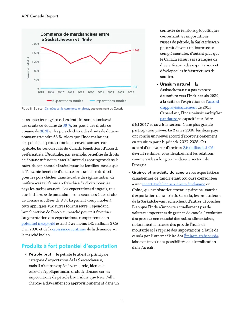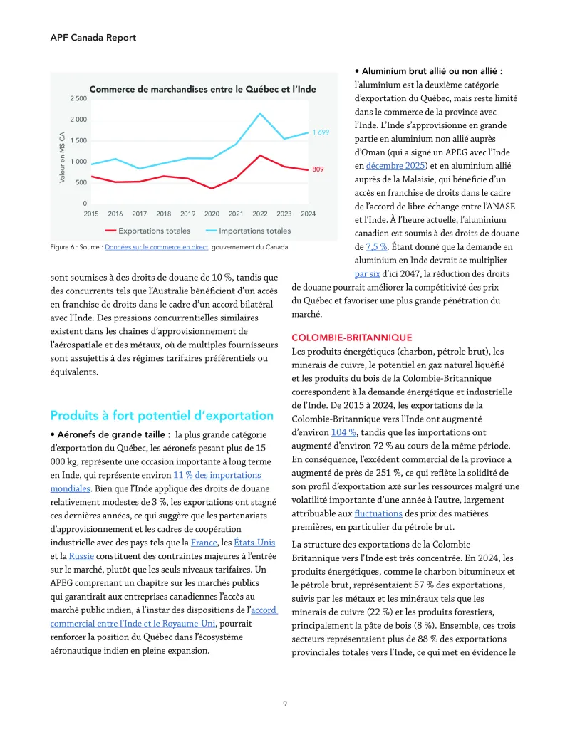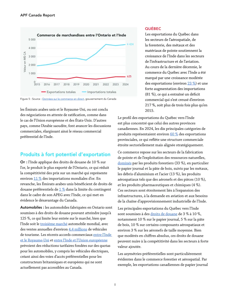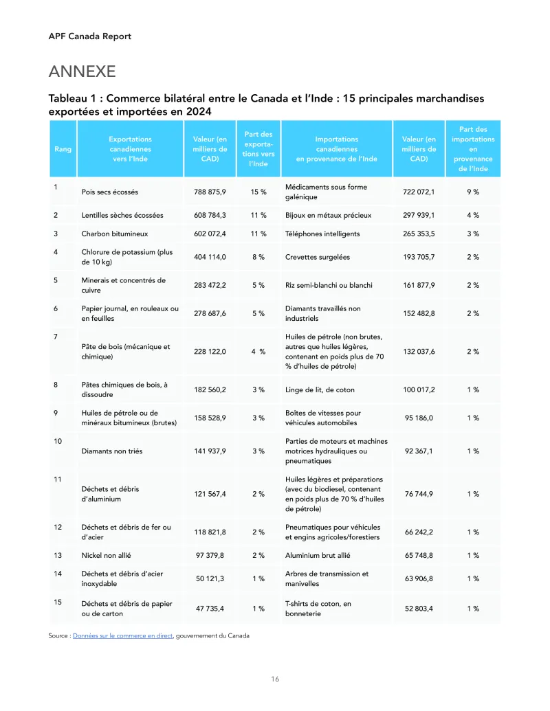 L’Inde, quant à elle, étend rapidement son réseau commercial préférentiel avec des partenaires tels que l’Australie, les Émirats arabes unis, l’Association européenne de libre-échange (AELE), le Royaume- Uni, l’Union européenne et les États-Unis. Sans accès préférentiel, les exportateurs canadiens risquent de voir leur compétitivité s’éroder progressivement sur l’un des marchés les plus dynamiques au monde.