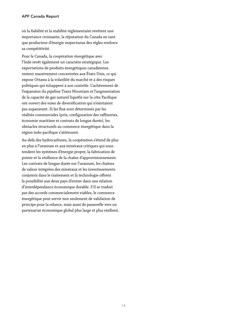 6. Les secteurs de l’énergie et des minéraux critiques pourraient servir de point d’ancrage à une relance économique plus large. La conclusion, le 2 mars dernier, d’un accord d’approvisionnement en uranium d’une valeur de 2,6 millions $ CA marque le renouveau de la coopération énergétique entre les deux pays, qui s’étend également au commerce de gaz naturel liquéfié, de pétrole brut, de combustibles propres et de minéraux critiques. Il s’agit de transformer cet élan politique en projets commercialement viables pour contribuer à instaurer la confiance et à générer des avancées concrètes qui viendront étayer un accord commercial plus large.