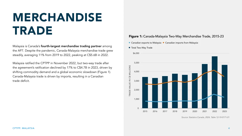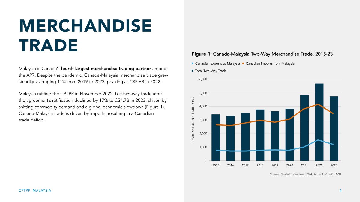 En examinant les relations commerciales bilatérales avec la Malaisie, tant au niveau national qu'infranational, au cours des cinq années suivant la ratification du PTPGP (de 2019 à 2023), et en utilisant les données de 2018 comme contexte, notre Mini-Rapport PTPGP sur la Malaisie ci-dessous identifie les futures opportunités commerciales pour les entreprises canadiennes souhaitant élargir leur présence en Malaisie.