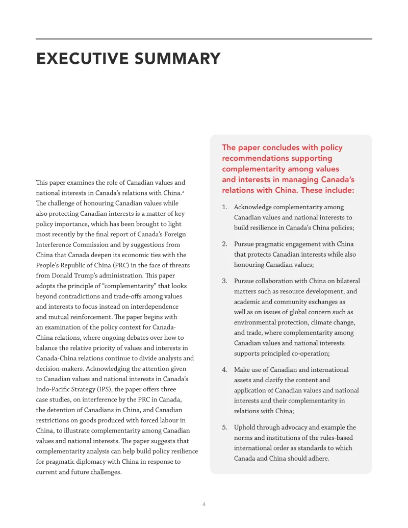 4. Make use of Canadian and international assets and clarify the content and application of Canadian values and national interests and their complementarity in relations with China.