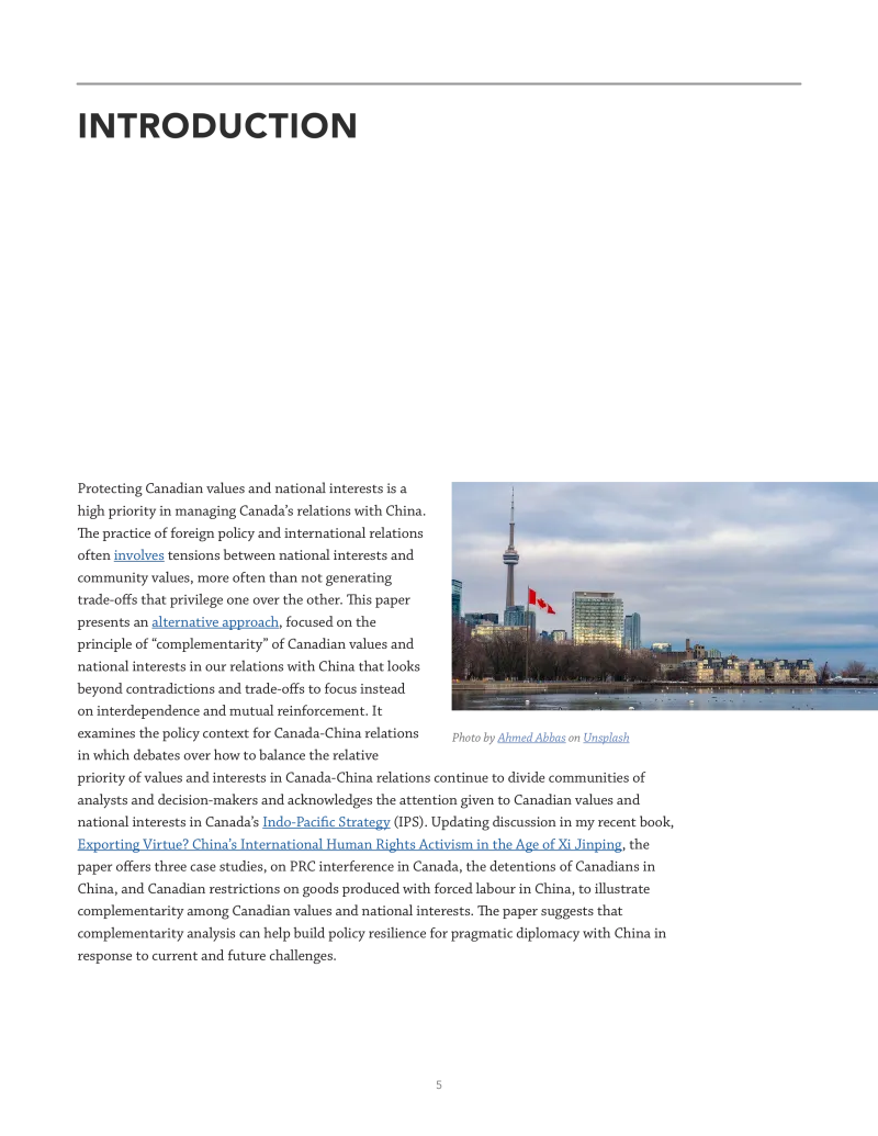 This paper adopts the principle of “complementarity” that looks beyond contradictions and trade-offs among values and interests to focus instead on interdependence and mutual reinforcement. The paper begins with an examination of the policy context for Canada- China relations, where ongoing debates over how to balance the relative priority of values and interests in Canada‑China relations continue to divide analysts and decision-makers.