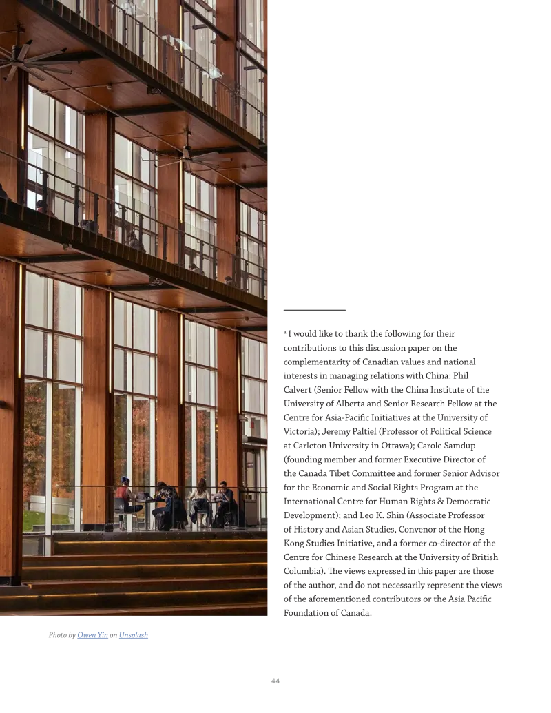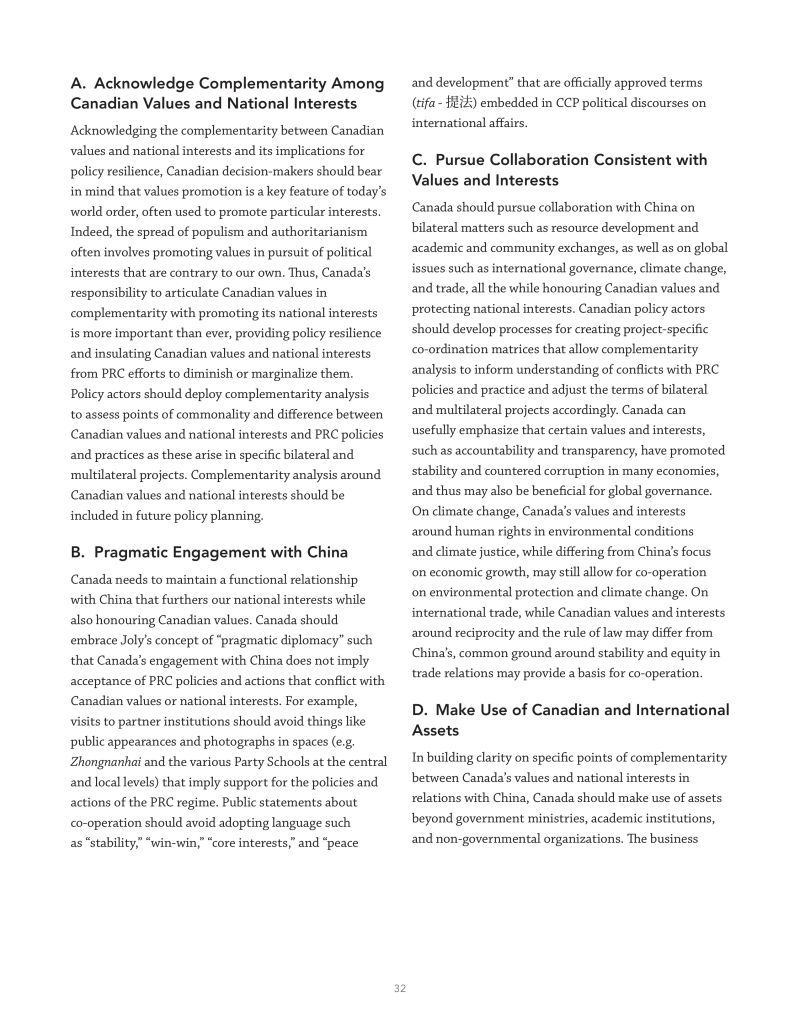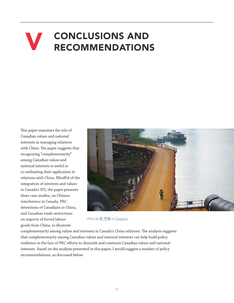 Dr. Potter's paper concludes with policy recommendations supporting complementarity among values and interests in managing Canada’s relations with China. These include: