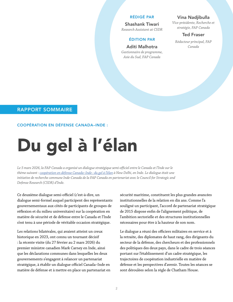 Le 5 mars 2026, la FAP Canada a organisé un dialogue stratégique semi-officiel entre le Canada et l’Inde sur le thème suivant : coopération en défense Canada–Inde : du gel à l’élan à New Delhi, en Inde. Le dialogue était une initiative de recherche commune Inde-Canada de la FAP Canada en partenariat avec le Council for Strategic and Defense Research (CSDR) d’Inde.