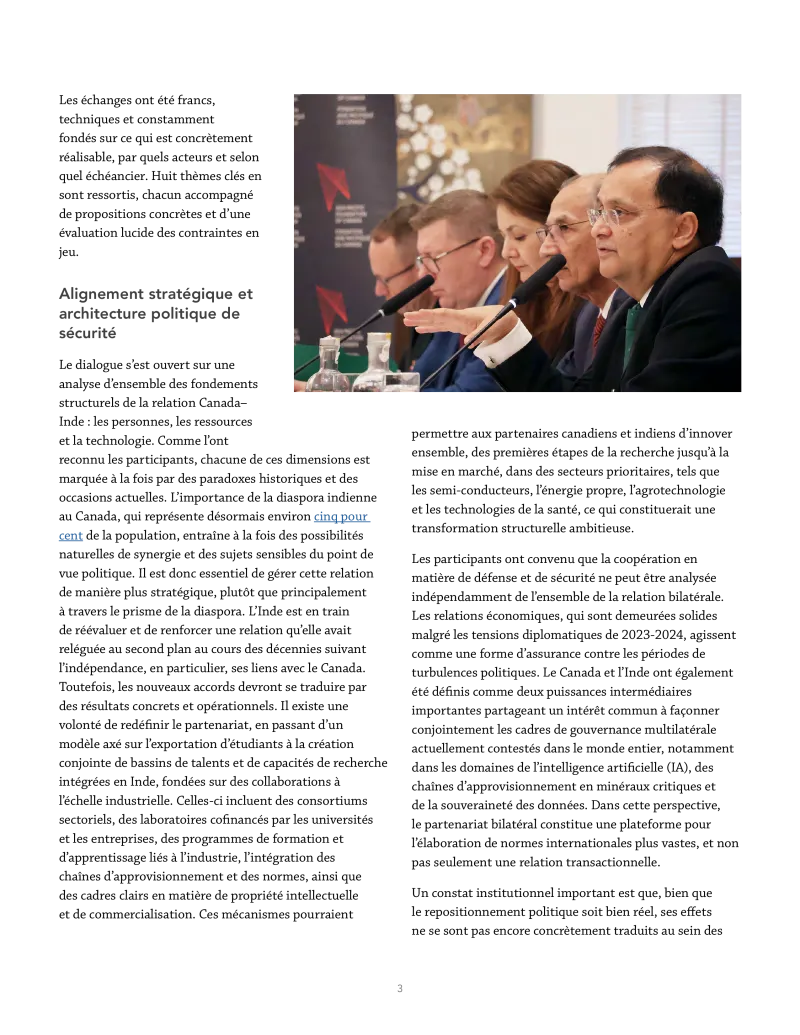 Les participants ont convenu que la déclaration commune des dirigeants du Canada et de l’Inde offre un programme concret et pragmatique, couvrant le matériel de défense, la résilience des chaînes d’approvisionnement, les exercices d’entraînement, la cybersécurité, l’intelligence artificielle (IA), les semi-conducteurs et les écosystèmes d’innovation de confiance. Cela dit, un consensus s’est dégagé sur le fait que ces cadres ne prennent véritablement sens que lorsqu’ils sont rendus opérationnels.