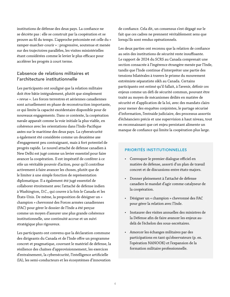 - Entamer les échanges militaires bilatéraux selon l’approche « ramper-marcher-courir », en commençant par des échanges d’observateurs lors d’exercices comme l’Opération NANOOK, en tirant parti des cadres d’exercices tiers auxquels l’Inde participe déjà, et en élargissant les échanges de formation militaire professionnelle à tous les échelons.