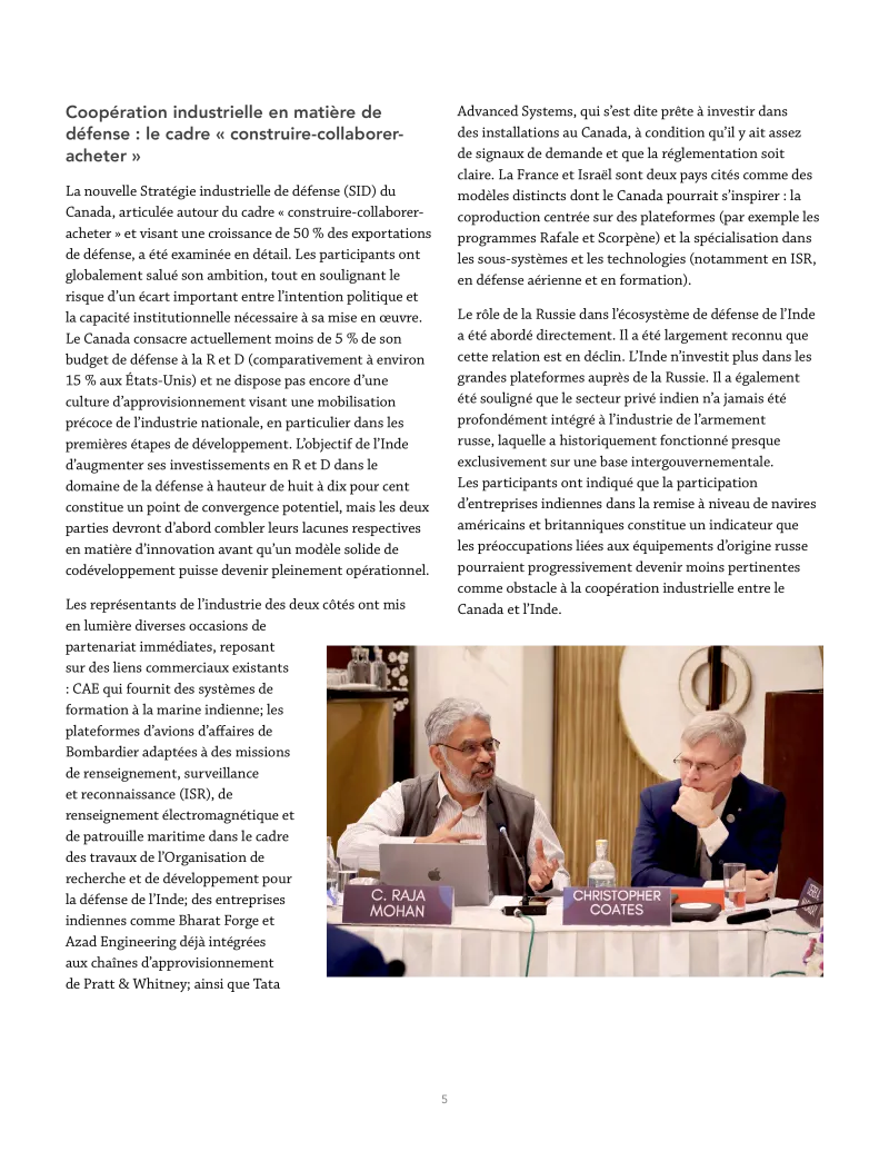 Les représentants de l’industrie des deux côtés ont mis en lumière diverses occasions de partenariat immédiates, reposant sur des liens commerciaux existants : CAE qui fournit des systèmes de formation à la marine indienne; les plateformes d’avions d’affaires de Bombardier adaptées à des missions de renseignement, surveillance et reconnaissance (ISR), de renseignement électromagnétique et de patrouille maritime dans le cadre des travaux de l’Organisation de recherche et de développement pour la défense de l’Inde; des entreprises indiennes comme Bharat Forge et Azad Engineering déjà intégrées aux chaînes d’approvisionnement de Pratt & Whitney; ainsi que Tata Advanced Systems, qui s’est dite prête à investir dans des installations au Canada, à condition qu’il y ait assez de signaux de demande et que la réglementation soit claire. La France et Israël sont deux pays cités comme des modèles distincts dont le Canada pourrait s’inspirer : la coproduction centrée sur des plateformes (par exemple les programmes Rafale et Scorpène) et la spécialisation dans les sous-systèmes et les technologies (notamment en ISR, en défense aérienne et en formation).