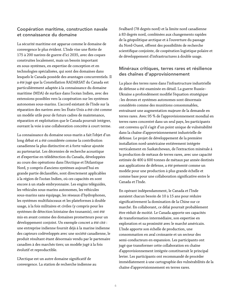 La sécurité maritime est apparue comme le domaine de convergence le plus évident. L’Inde vise une flotte de 175 à 200 navires de guerre d’ici 2035, avec des coques construites localement, mais un besoin important en sous-systèmes, en expertise de conception et en technologies spécialisées, qui sont des domaines dans lesquels le Canada possède des avantages concurrentiels. Il a été jugé que la Constellation RADARSAT du Canada est particulièrement adaptée à la connaissance du domaine maritime (MDA) de surface dans l’océan Indien, avec des extensions possibles vers la coopération sur les systèmes autonomes sous-marins. L’accord existant de l’Inde sur la réparation des navires avec les États-Unis a été cité comme un modèle utile pour de futurs cadres de maintenance, réparation et exploitation que le Canada pourrait intégrer, ouvrant la voie à une collaboration concrète à court terme.