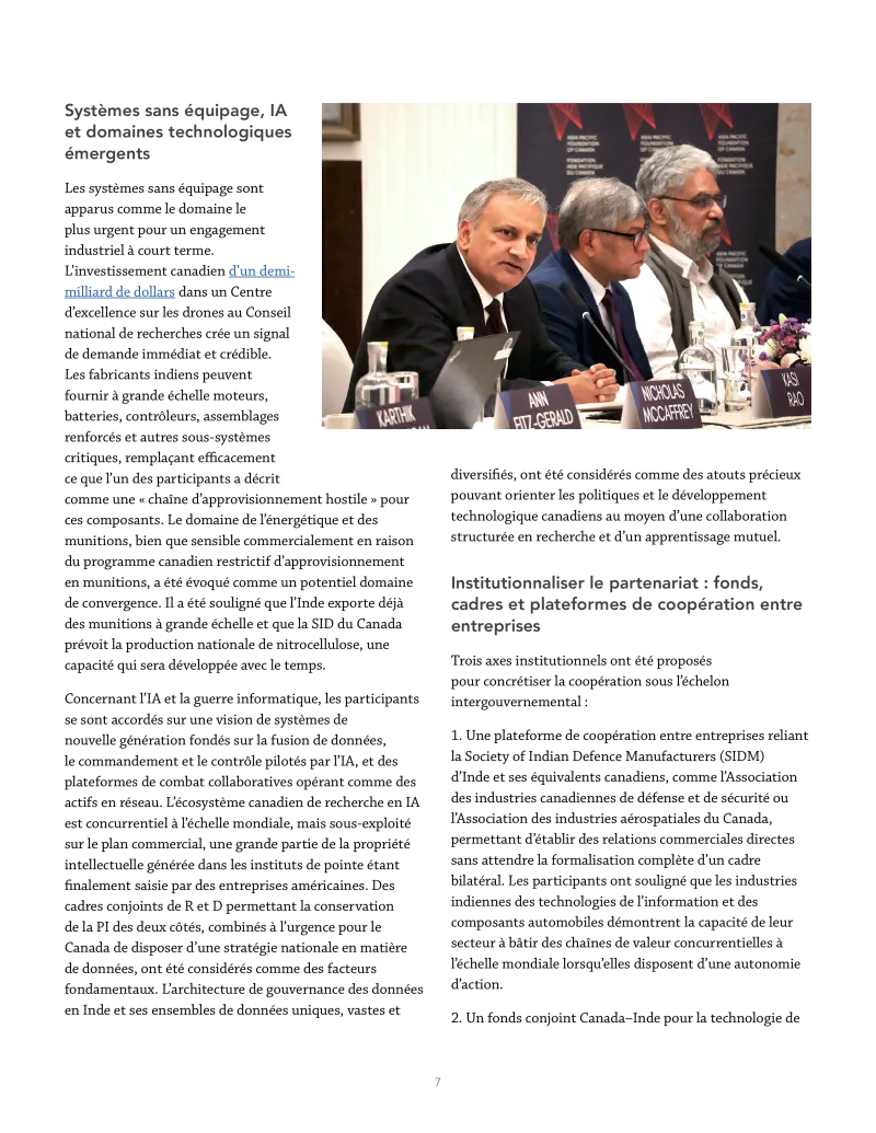 1. Une plateforme de coopération entre entreprises reliant la Society of Indian Defence Manufacturers (SIDM) d’Inde et ses équivalents canadiens, comme l’Association des industries canadiennes de défense et de sécurité ou l’Association des industries aérospatiales du Canada, permettant d’établir des relations commerciales directes sans attendre la formalisation complète d’un cadre bilatéral. Les participants ont souligné que les industries indiennes des technologies de l’information et des composants automobiles démontrent la capacité de leur secteur à bâtir des chaînes de valeur concurrentielles à l’échelle mondiale lorsqu’elles disposent d’une autonomie d’action.
