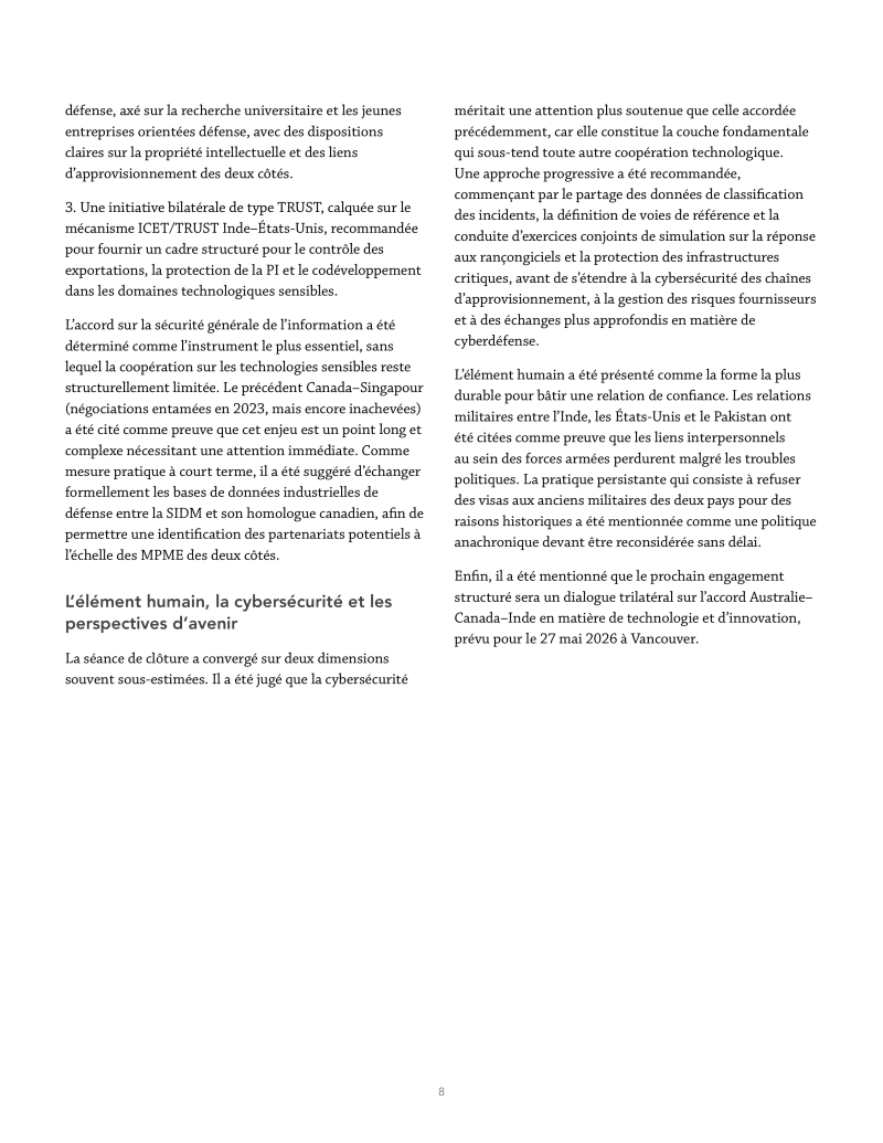 3. Une initiative bilatérale de type TRUST, calquée sur le mécanisme ICET/TRUST Inde–États-Unis, recommandée pour fournir un cadre structuré pour le contrôle des exportations, la protection de la PI et le codéveloppement dans les domaines technologiques sensibles.