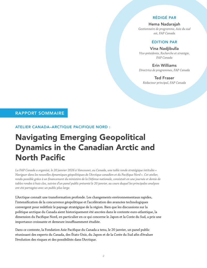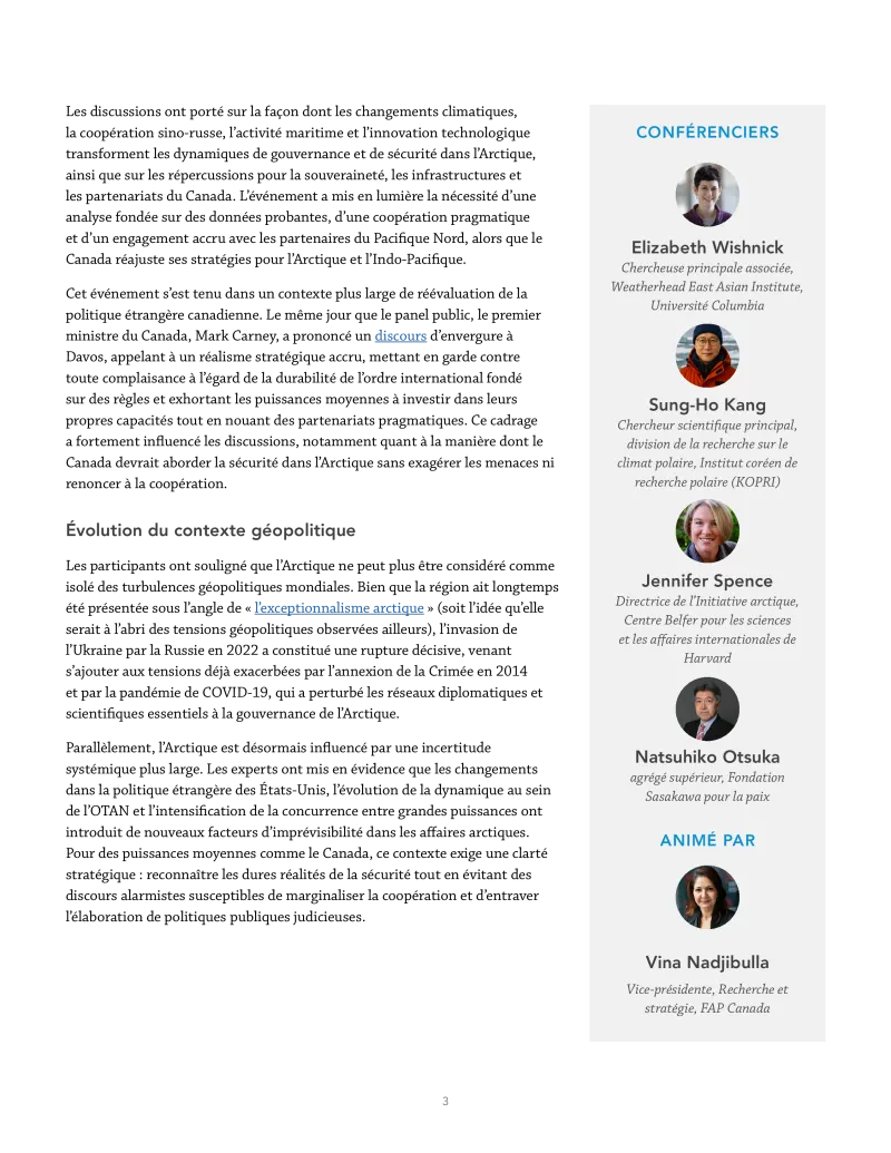 Le 20 janvier 2026, APF Canada a organisé à Vancouver, au Canada, une table ronde stratégique intitulée « Navigating Emerging Geopolitical Dynamics in the Canadian Arctic and North Pacific » (Faire face aux nouvelles dynamiques géopolitiques dans l'Arctique canadien et le Pacifique Nord). Cet événement, financé par le ministère de la Défense nationale, comprenait une table ronde à huis clos d'une journée et demie, suivie, le 20 janvier, d'une table ronde publique visant à présenter les principales conclusions à un public plus large.