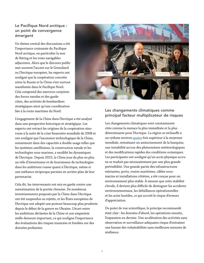 Les changements climatiques sont constamment cités comme la menace la plus immédiate et la plus déterminante pour l’Arctique. La région se réchauffe à un rythme environ quatre fois supérieur à la moyenne mondiale, entraînant un amincissement de la banquise, une instabilité accrue des phénomènes météorologiques et des modifications rapides des conditions océaniques. Les participants ont souligné qu’un accès physique accru ne se traduit pas nécessairement par une plus grande prévisibilité. Une grande partie des infrastructures existantes, ports, routes maritimes, câbles sous-marins et installations côtières, a été conçue pour un environnement plus stable. À mesure que cette stabilité s’érode, il devient plus difficile de distinguer les accidents environnementaux, les défaillances opérationnelles et les actes hostiles, ce qui accroît le risque d’erreurs d’appréciation.