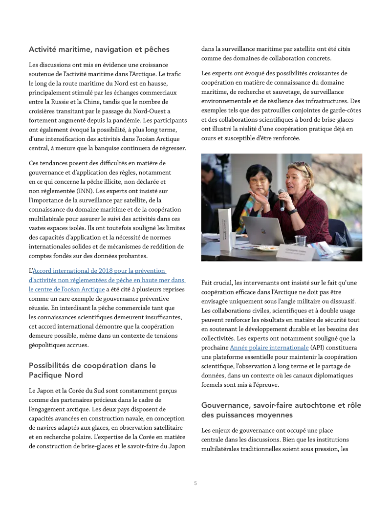 Les discussions ont mis en évidence une croissance soutenue de l’activité maritime dans l’Arctique. Le trafic le long de la route maritime du Nord est en hausse, principalement stimulé par les échanges commerciaux entre la Russie et la Chine, tandis que le nombre de croisières transitant par le passage du Nord-Ouest a fortement augmenté depuis la pandémie. Les participants ont également évoqué la possibilité, à plus long terme, d’une intensification des activités dans l’océan Arctique central, à mesure que la banquise continuera de régresser.
