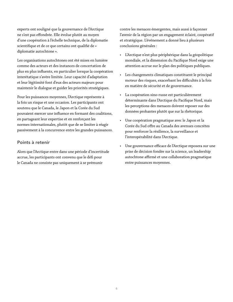 - L’Arctique n’est plus périphérique dans la géopolitique mondiale, et la dimension du Pacifique Nord exige une attention accrue sur le plan des politiques publiques.