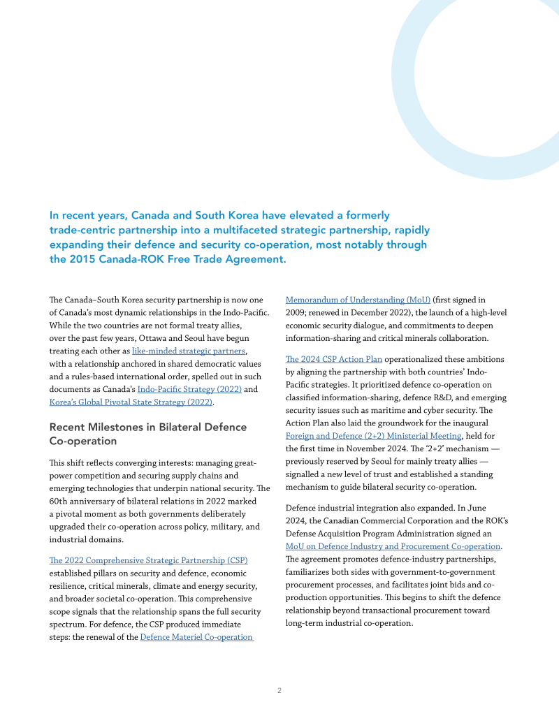 In recent years, Canada and South Korea have elevated a formerly trade-centric partnership into a multifaceted strategic partnership, rapidly expanding their defence and security co-operation, most notably through the 2015 Canada-ROK Free Trade Agreement.