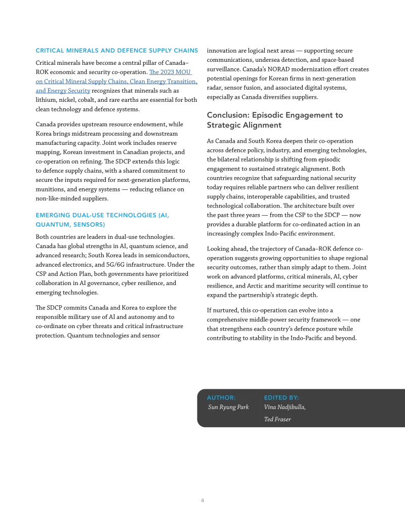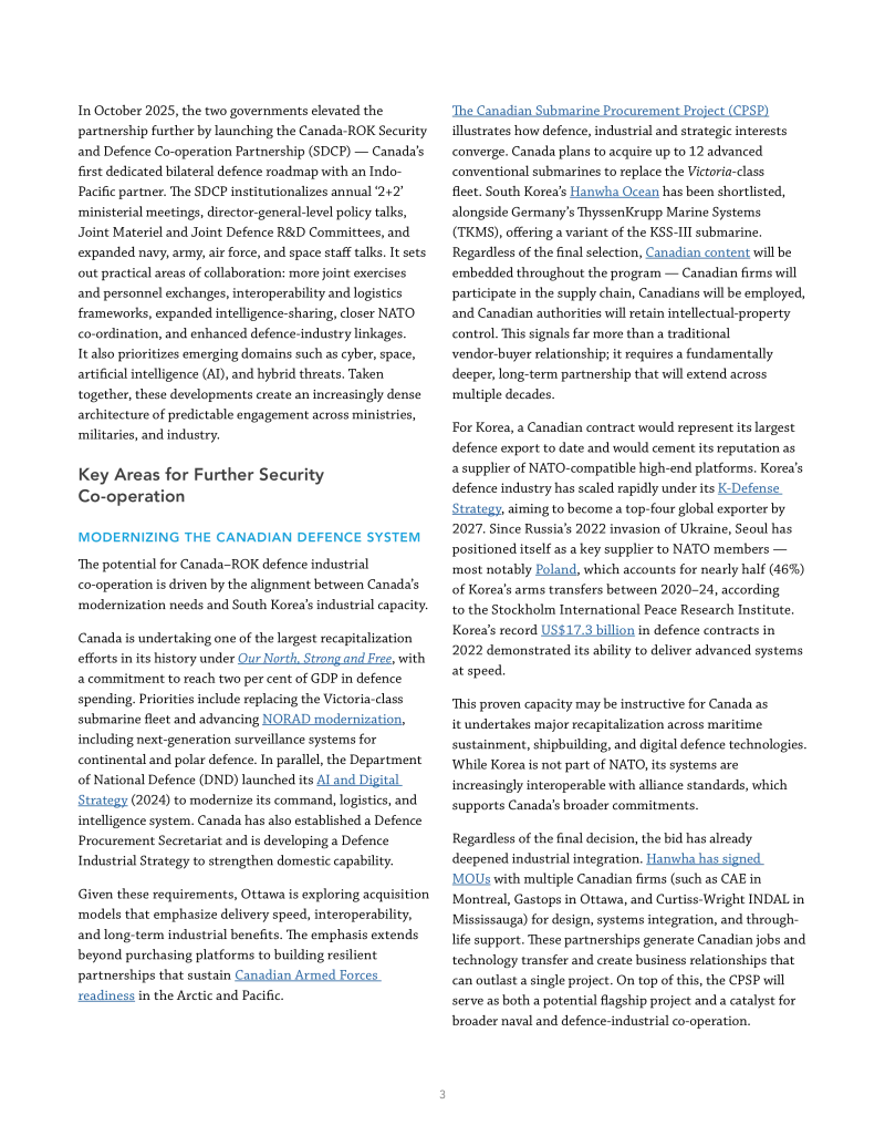 In October 2025, the two governments elevated the partnership further by launching the Canada-ROK Security and Defence Co-operation Partnership (SDCP) — Canada’s first dedicated bilateral defence roadmap with an Indo-Pacific partner. The SDCP institutionalizes annual ‘2+2’ ministerial meetings, director-general-level policy talks, Joint Materiel and Joint Defence R&D Committees, and expanded navy, army, air force, and space staff talks. It sets out practical areas of collaboration: more joint exercises and personnel exchanges, interoperability and logistics frameworks, expanded intelligence-sharing, closer NATO co-ordination, and enhanced defence-industry linkages. It also prioritizes emerging domains such as cyber, space, artificial intelligence (AI), and hybrid threats. Taken together, these developments create an increasingly dense architecture of predictable engagement across ministries, militaries, and industry.
