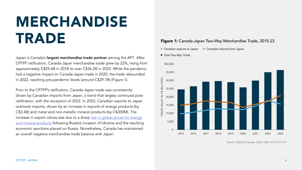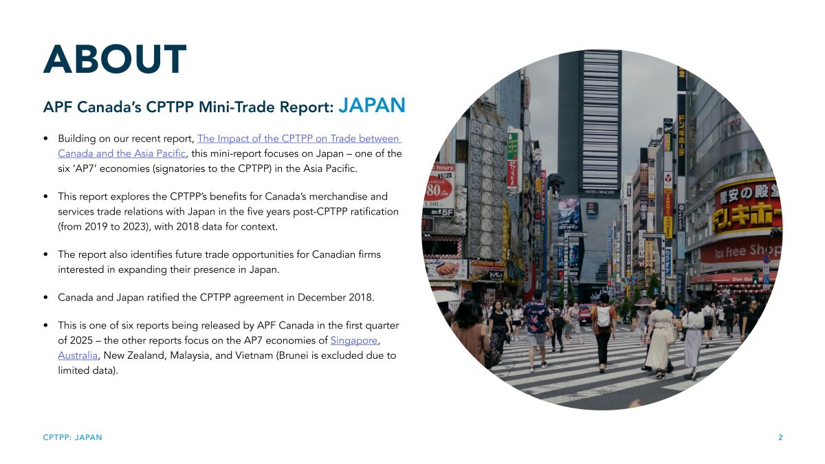 The third in APF Canada's series on the impact of the CPTPP on merchandise and services trade between Canada and Asia, this 'mini-report' focuses on Japan, one of the seven ‘AP7’ economies (signatories to the CPTPP) in the Asia Pacific.