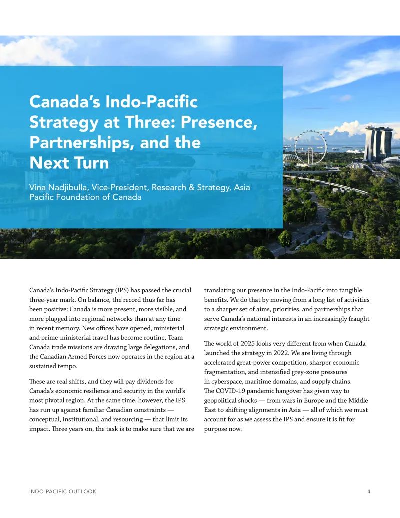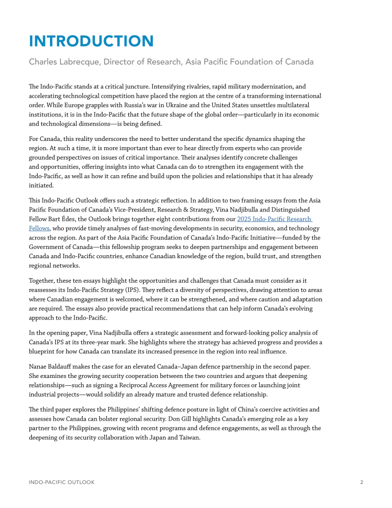 This report represents such a strategic reflection. It brings together eight contributions from our 2025 Indo-Pacific Research Fellows, who provide timely analyses of fast-moving developments in security, economics, and technology across the region. As part of the Asia Pacific Foundation of Canada’s Indo-Pacific Initiative programming, with funding provided by the Government of Canada, this fellowship program is designed to deepen partnerships and engagement between Canada and countries in the Indo-Pacific region, contribute to Canadian knowledge about the region, build trust, and support regional networks.