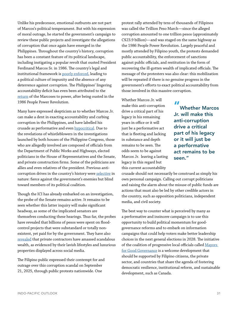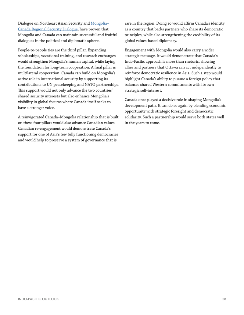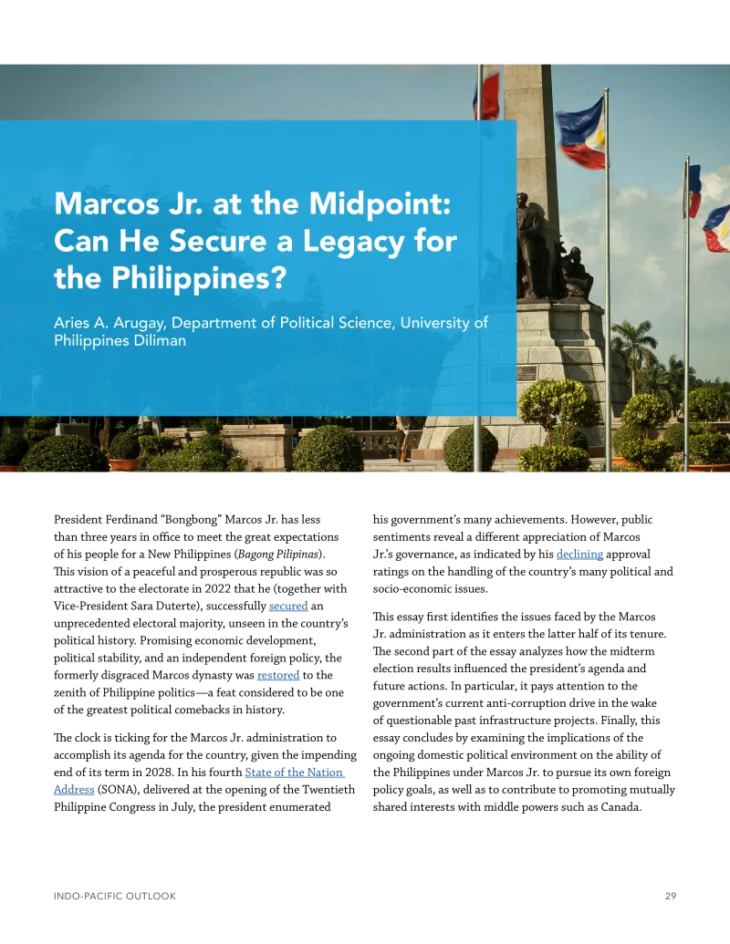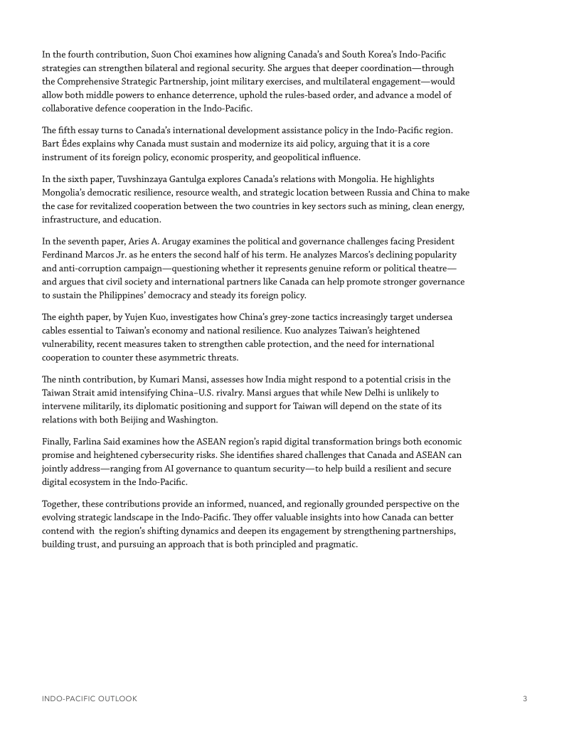 Together, these essays highlight both the opportunities and challenges that Canada must take into account as it advances its Indo-Pacific Strategy. They reflect a diversity of views within the region, drawing attention to areas where Canadian engagement is welcomed, areas where it can be strengthened, and areas where caution and adaptation are required. The Fellows also provide practical recommendations that can help inform Canada’s future approach to the Indo-Pacific.