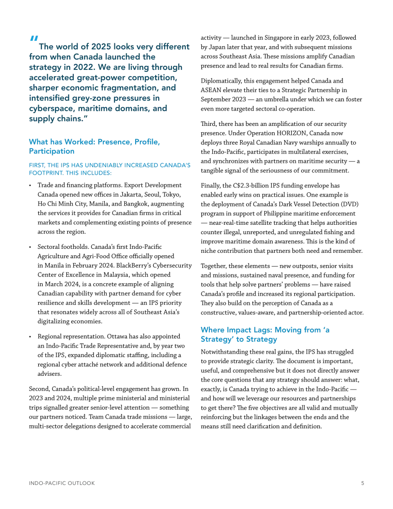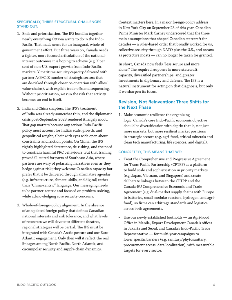 But presence is a means, not an end. The world has shifted under our feet; assumptions that once underpinned Canadian foreign policy are now contested. In this environment, a revised and reprioritized IPS — nested within a clear national foreign policy, geared to economic resilience and hard-edged partnership, and powered by real Asia competence — can help Canada convert its activity into real advantage.