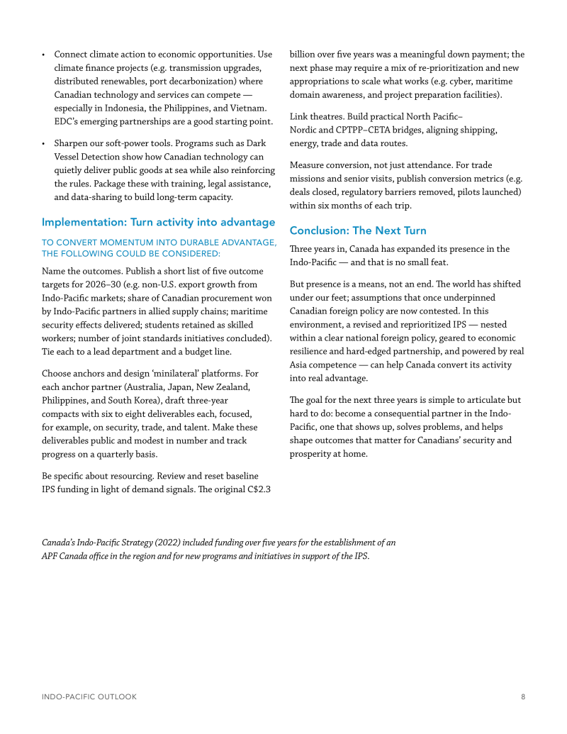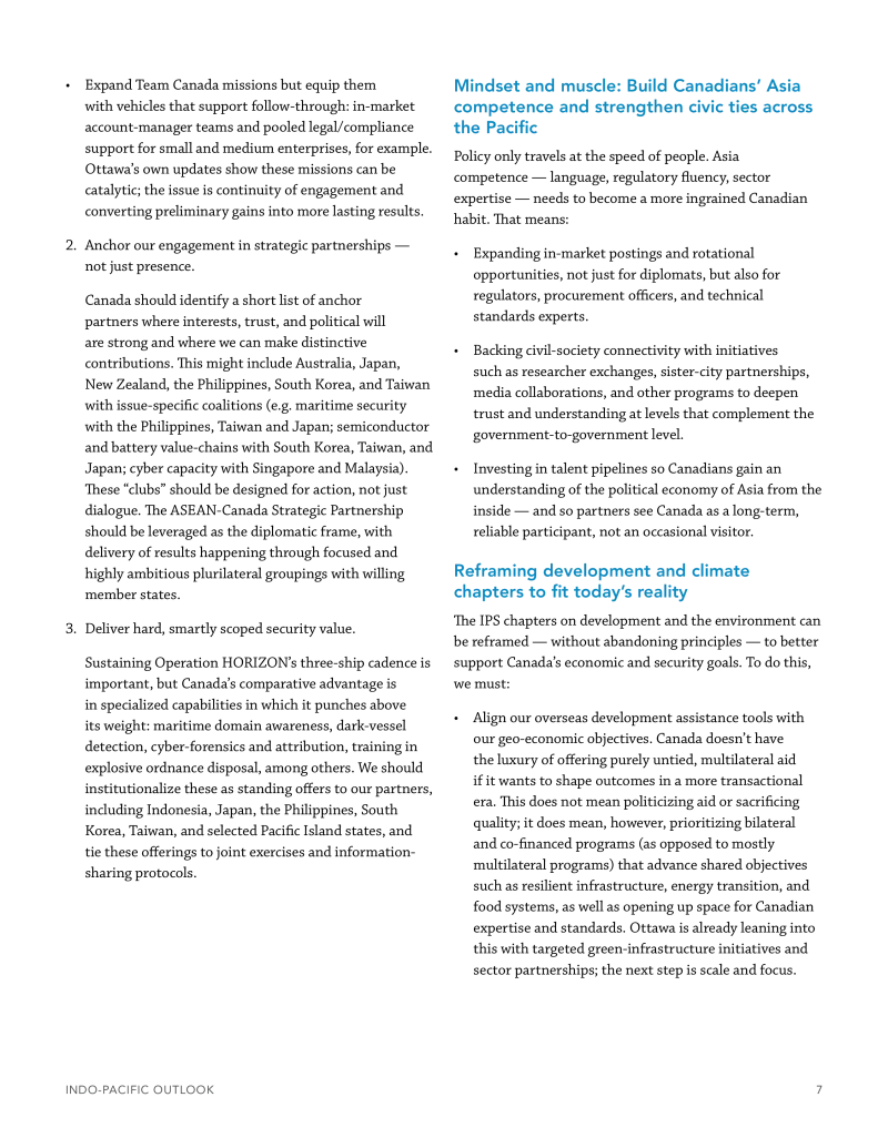 1. Ends and prioritization. The IPS bundles together nearly everything Ottawa wants to do in the Indo-Pacific. That made sense for an inaugural, whole-of-government effort. But three years on, Canada needs a tighter, more focused articulation of the national-interest outcomes it is hoping to achieve (e.g. X per cent of non-U.S. export growth from Indo-Pacific markets; Y maritime security capacity delivered with partner A/B/C; Z number of strategic sectors that are de-risked through closer co-operation with allies’ value-chains), with explicit trade-offs and sequencing. Without prioritization, we run the risk that activity becomes an end in itself.