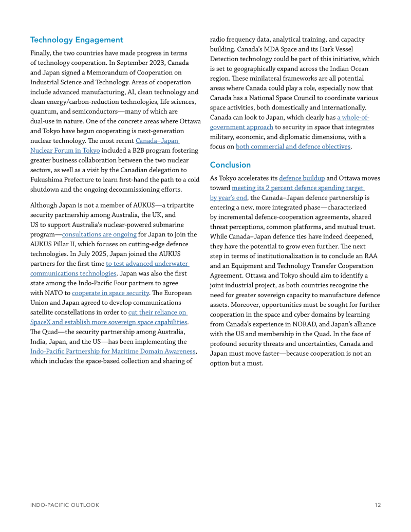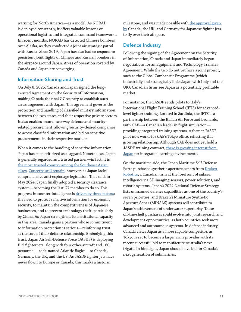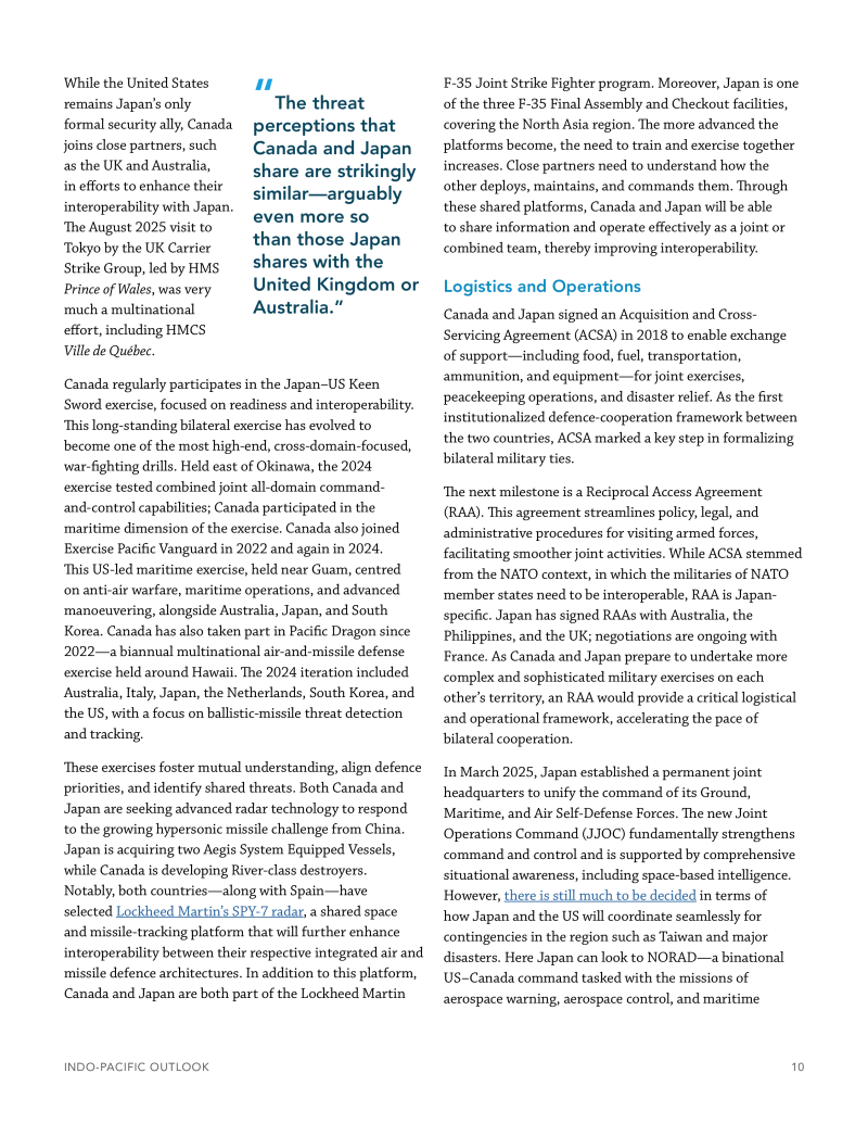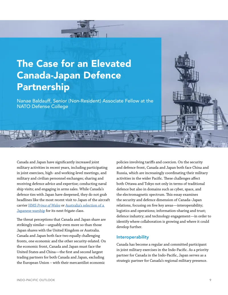 The threat perceptions that Canada and Japan share are strikingly similar—arguably even more so than those Japan shares with the United Kingdom or Australia. Canada and Japan both face two equally challenging fronts, one economic and the other security-related. On the economic front, Canada and Japan must face the United States and China—the first and second largest trading partners for both Canada and Japan, excluding the European Union – with their mercantilist economic policies involving tariffs and coercion. On the security and defence front, Canada and Japan both face China and Russia, which are increasingly coordinating their military activities in the wider Pacific. These challenges affect both Ottawa and Tokyo not only in terms of traditional defence but also in domains such as cyber, space, and the electromagnetic spectrum. This essay examines the security and defence dimension of Canada–Japan relations, focusing on five key areas—interoperability; logistics and operations; information-sharing and trust; defence industry; and technology engagement—in order to identify where collaboration is growing and where it could develop further.
