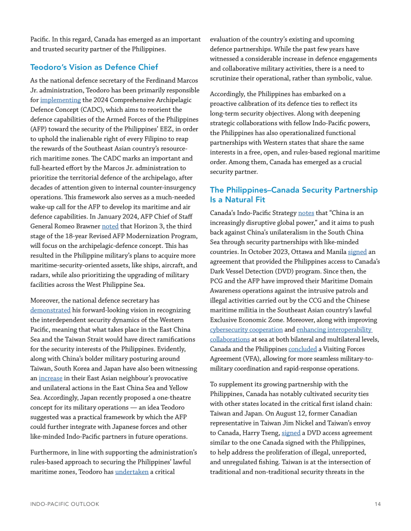 Canada's Indo-Pacific Strategy notesthat “China is an increasingly disruptive global power,” and it aims to push back against China’s unilateralism in the South China Sea through security partnerships with like-minded countries. In October 2023, Ottawa and Manila signedan agreement that provided the Philippines access to Canada’s Dark Vessel Detection (DVD) program. Since then, the PCG and the AFP have improved their Maritime Domain Awareness operations against the intrusive patrols and illegal activities carried out by the CCG and the Chinese maritime militia in the Southeast Asian country’s lawful Exclusive Economic Zone. Moreover, along with improving cybersecurity cooperation and enhancing interoperability collaborations at sea at both bilateral and multilateral levels, Canada and the Philippines concluded a Visiting Forces Agreement (VFA), allowing for more seamless military-to-military coordination and rapid-response operations.