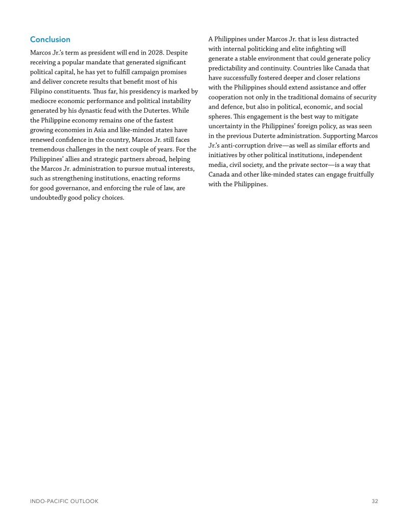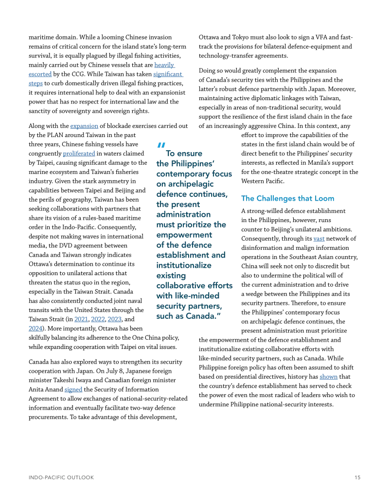 Doing so would greatly complement the expansion of Canada’s security ties with the Philippines and the latter’s robust defence partnership with Japan. Moreover, maintaining active diplomatic linkages with Taiwan, especially in areas of non-traditional security, would support the resilience of the first island chain in the face of an increasingly aggressive China. In this context, any effort to improve the capabilities of the states in the first island chain would be of direct benefit to the Philippines’ security interests, as reflected in Manila’s support for the one-theatre strategic concept in the Western Pacific.