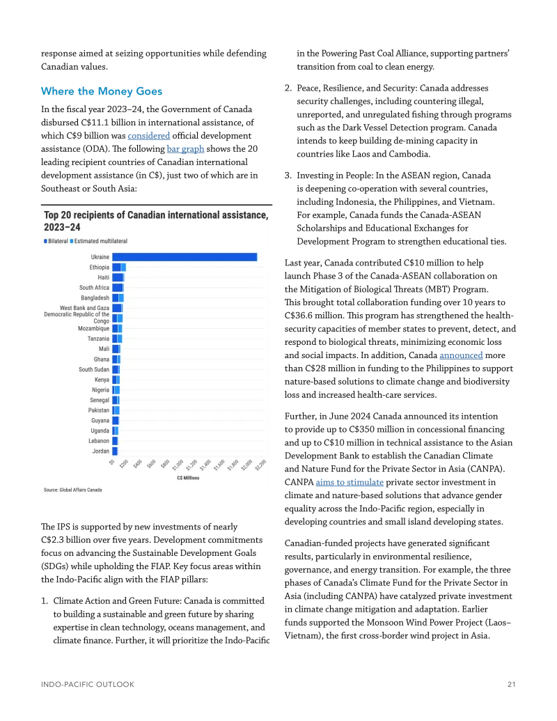2. Peace, Resilience, and Security:Canada addresses security challenges, including countering illegal, unreported, and unregulated fishing through programs such as the Dark Vessel Detection program. Canada intends to keep building de-mining capacity in countries like Laos and Cambodia.