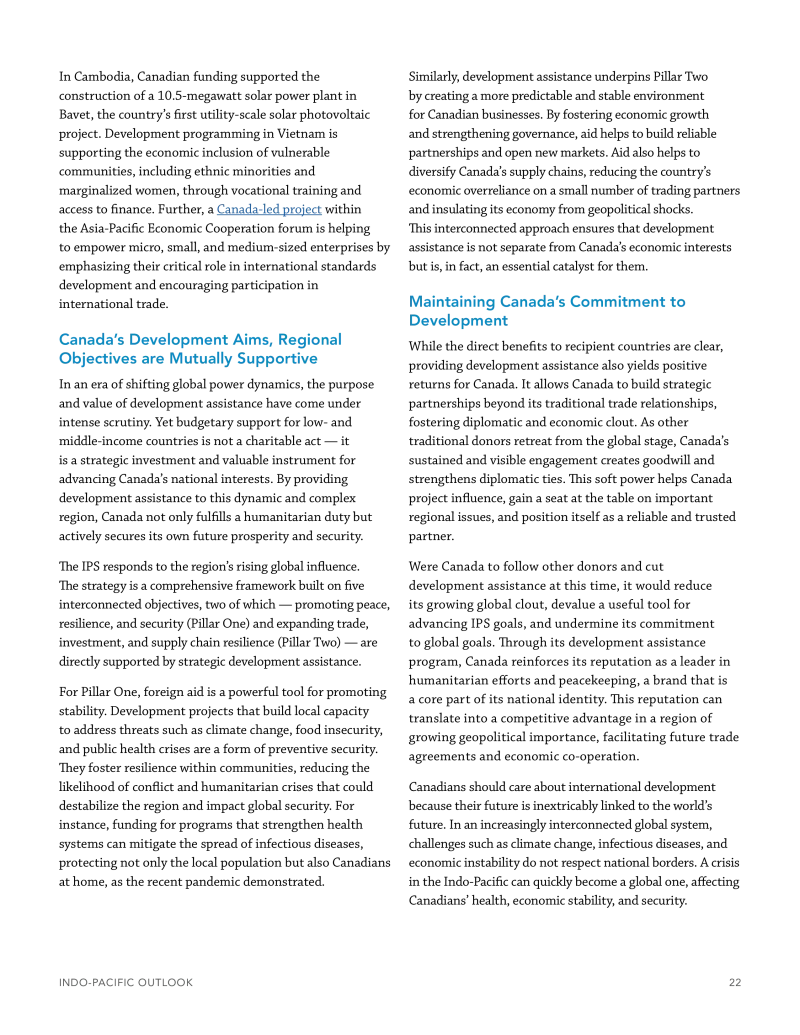 Canada’s development assistance programs support the IPS’s advances by promoting sustainable, inclusive growth, and resilience. Investments in climate, digital innovation, health, and gender equality improve security and opportunity, while fostering rules-based governance. Partnerships expand trade, people-to-people ties, and stability. Aligning aid with local priorities and multilateral initiatives builds trust and influence across the Indo-Pacific.