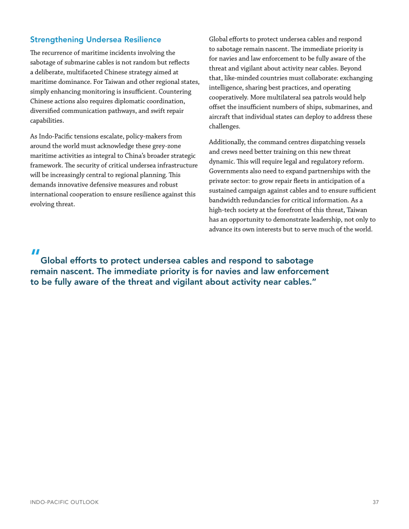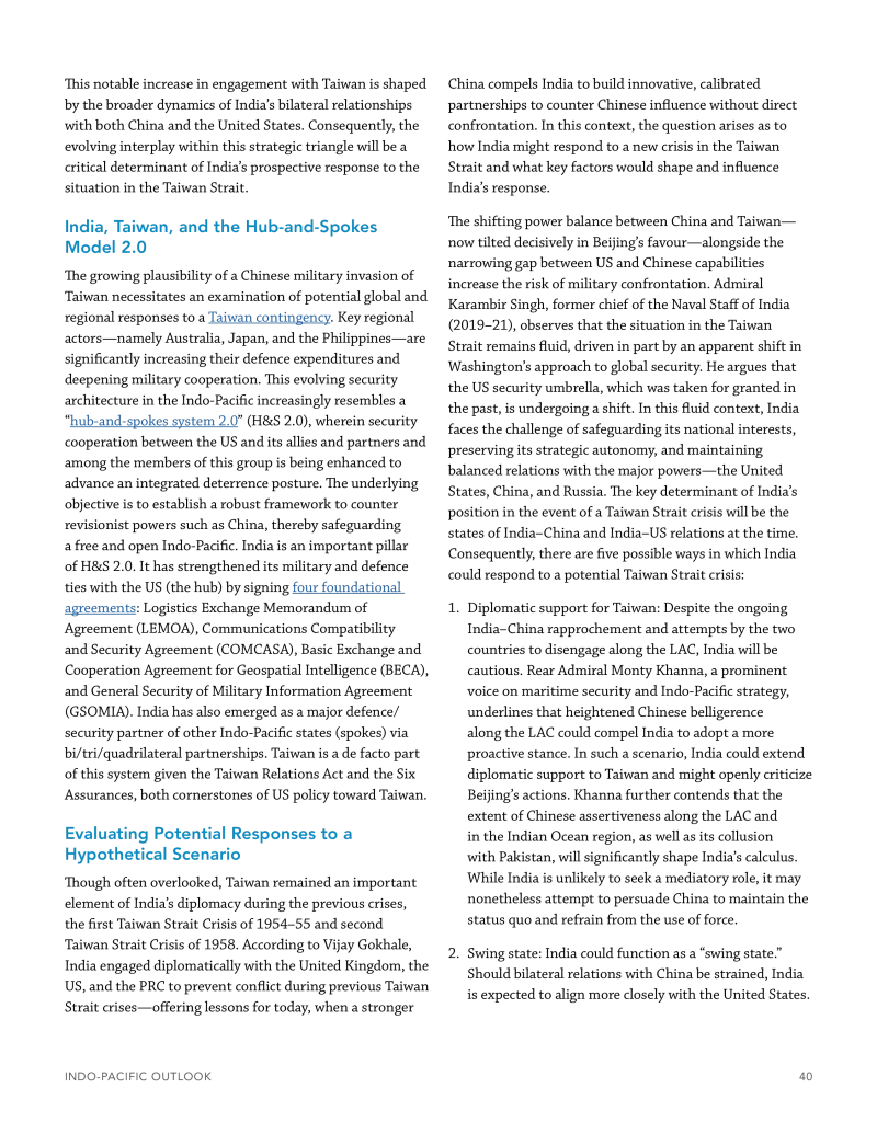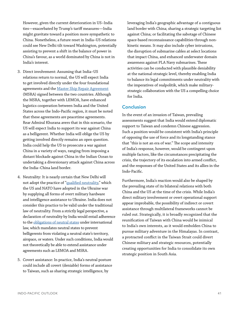 Covert assistance: In practice, India’s neutral posture could include all covert (deniable) forms of assistance to Taiwan, such as sharing strategic intelligence—by leveraging India’s geographic advantage of a contiguous land border with China—sharing a strategic targeting list against China, facilitating the sabotage of Chinese space-based reconnaissance capabilities through non-kinetic means. It may also include cyber intrusions, the disruption of submarine cables at select locations that impact China, and enhanced underwater domain awareness against PLA Navy submarines. These activities can be conducted with plausible deniability at the national strategic level, thereby enabling India to balance its legal commitments under neutrality with the imperatives of realpolitik, which makes military-strategic collaboration with the US a compelling imperative for India.