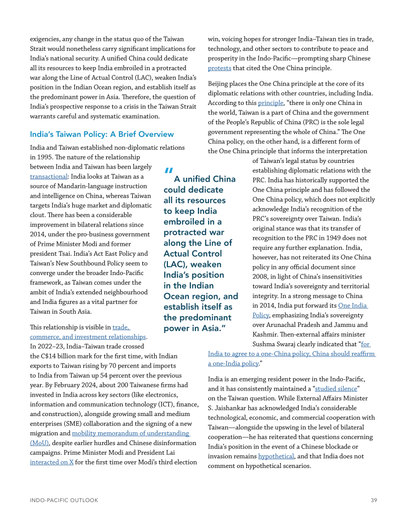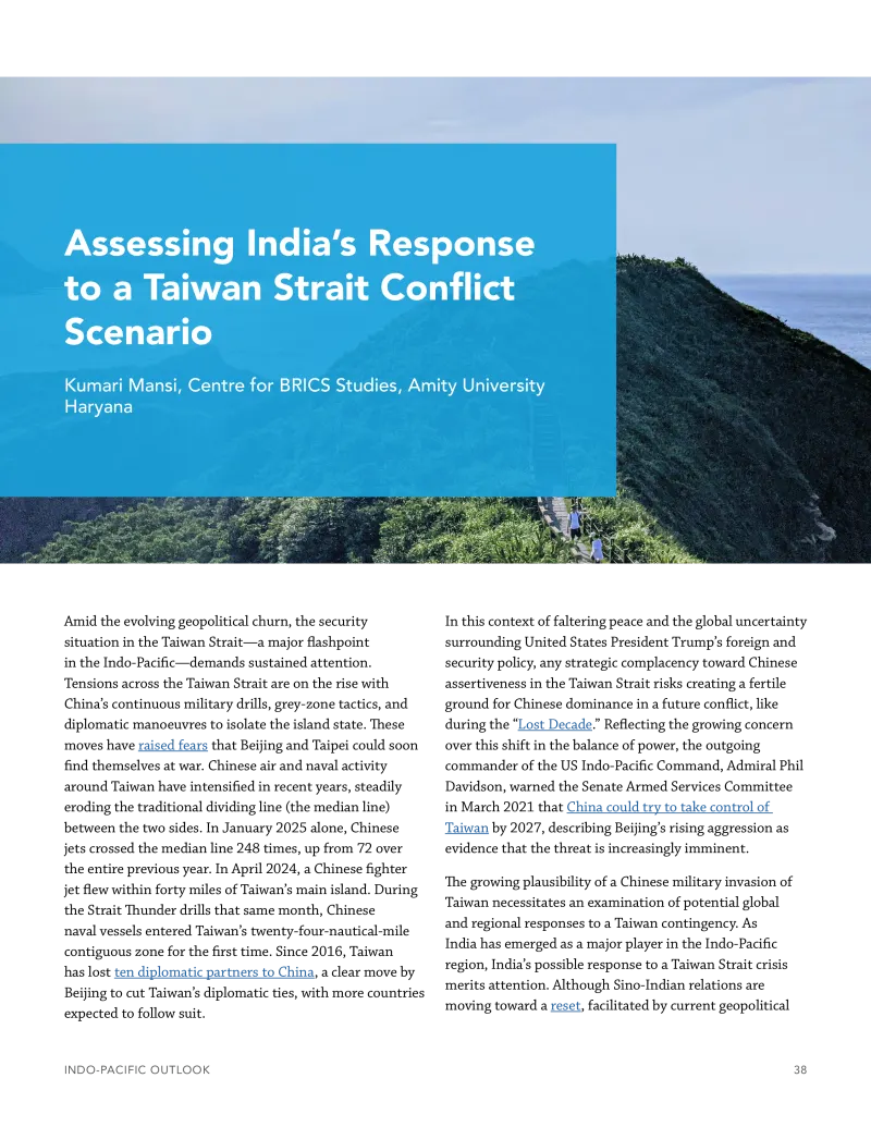 In the event of an invasion of Taiwan, prevailing assessments suggest that India would extend diplomatic support to Taiwan and condemn Chinese aggression. Such a position would be consistent with India’s principle of opposing the use of force and its longstanding stance that “this is not an era of war.” The scope and intensity of India’s response, however, would be contingent upon multiple factors, like the circumstances precipitating the crisis, the trajectory of its escalation into armed conflict, and the responses of the United States and its allies in the Indo-Pacific.