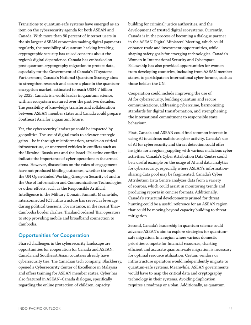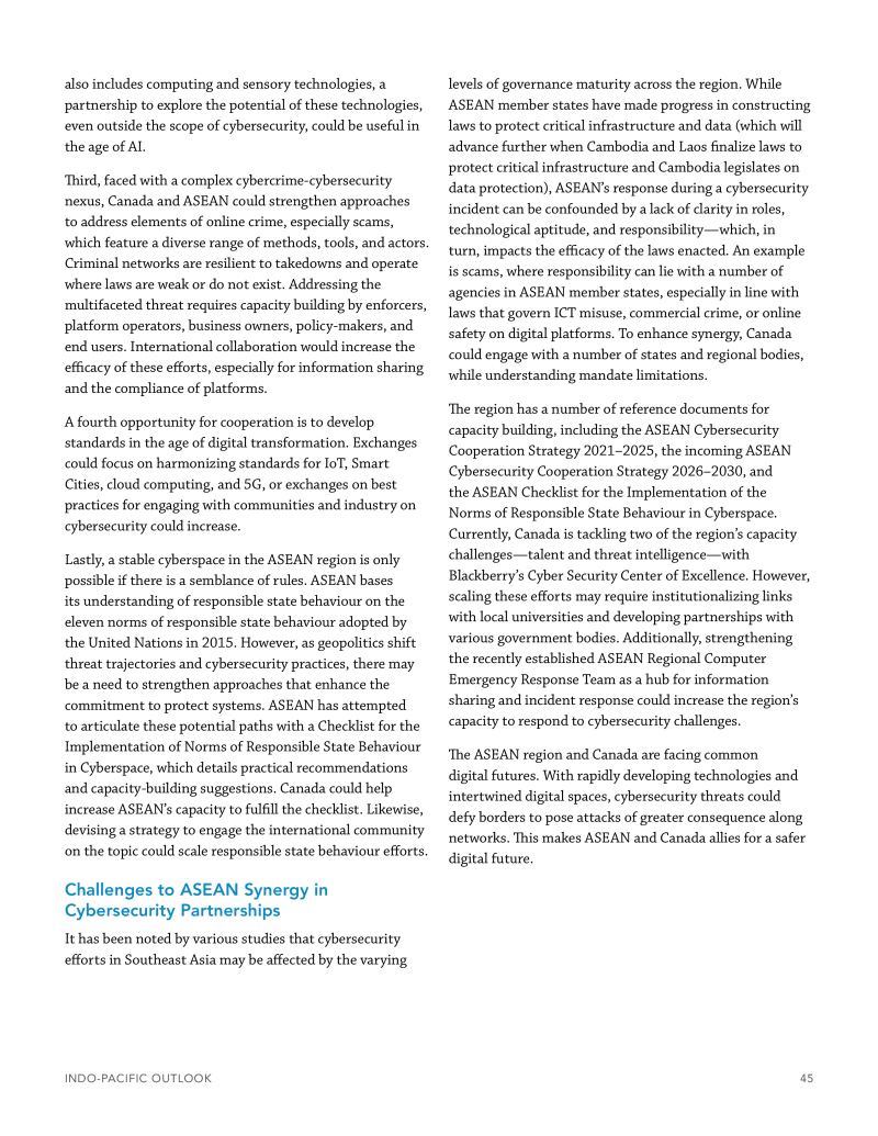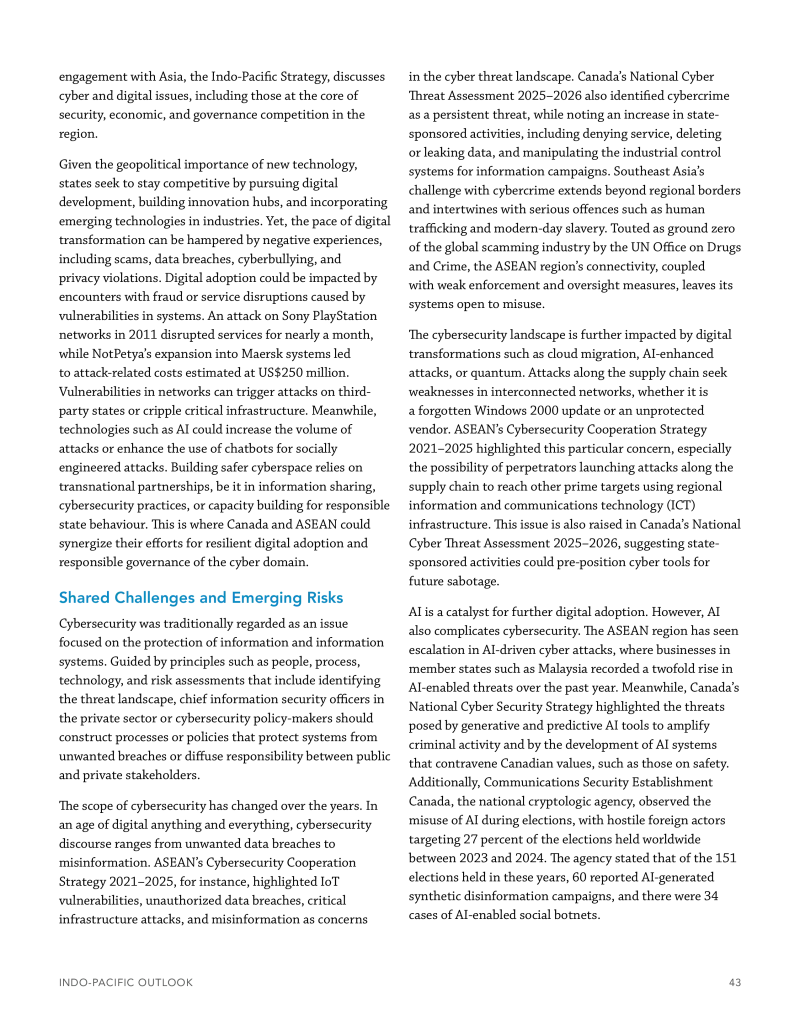 Given the geopolitical importance of new technology, states seek to stay competitive by pursuing digital development, building innovation hubs, and incorporating emerging technologies in industries. Yet, the pace of digital transformation can be hampered by negative experiences, including scams, data breaches, cyberbullying and privacy violations. Digital adoption could be impacted by encounters with fraud or service disruptions caused by vulnerabilities in systems. An attack on Sony PlayStation networks in 2011 disrupted services for nearly a month, while NotPetya’s expansion into Maersk systems led to attack-related costs estimated at US$250 million. Vulnerabilities in networks can trigger attacks on third-party states or cripple critical infrastructure. Meanwhile, technologies such as AI could increase volumes of attack or enhance the use of chatbots for socially engineered attacks. Building safer cyberspace relies on transnational partnerships, be it in information sharing, cybersecurity practices or capacity building for responsible state behaviour. This is where Canada and ASEAN could synergize their efforts for resilient digital adoption and responsible governance of cyber.