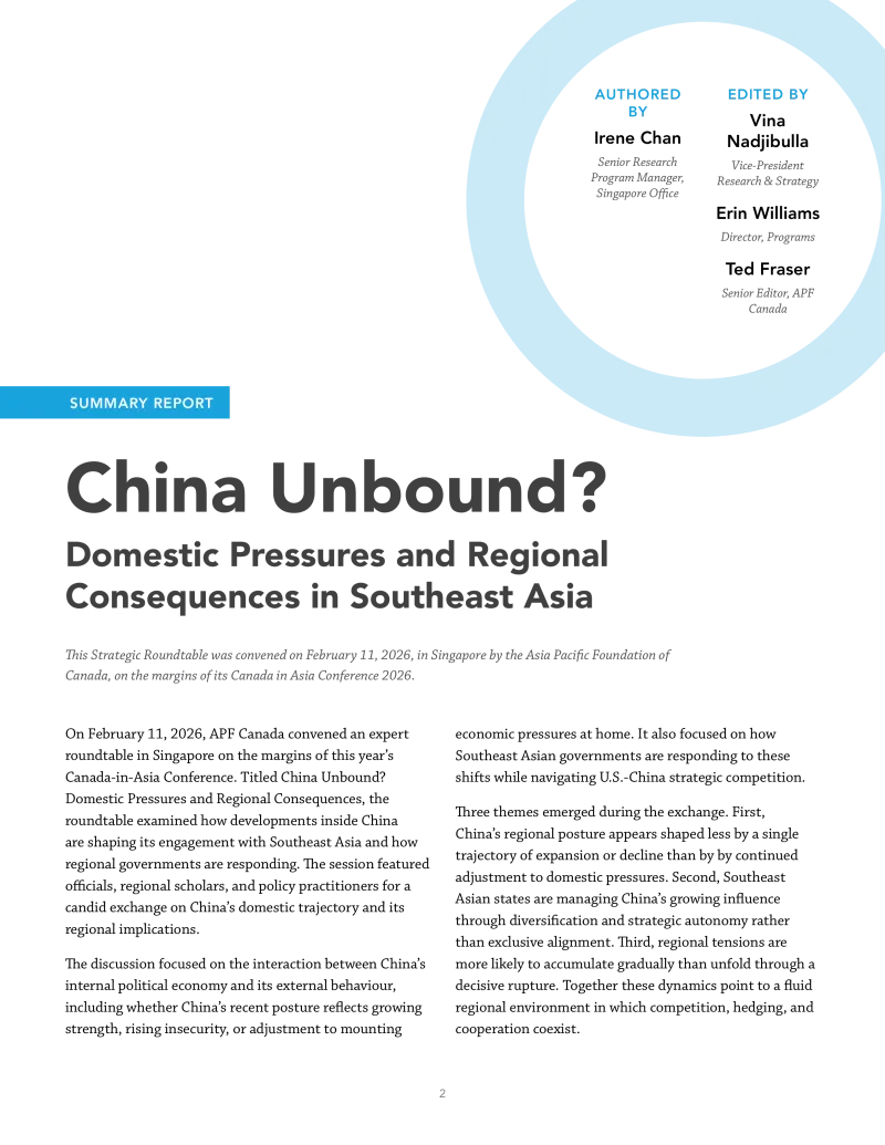 On February 11, 2026, APF Canada convened an expert roundtable in Singapore on the margins of this year’s Canada-in-Asia Conference. Titled China Unbound? Domestic Pressures and Regional Consequences, the roundtable examined how developments inside China are shaping its engagement with Southeast Asia and how regional governments are responding. The session featured officials, regional scholars, and policy practitioners for a candid exchange on China’s domestic trajectory and its regional implications.