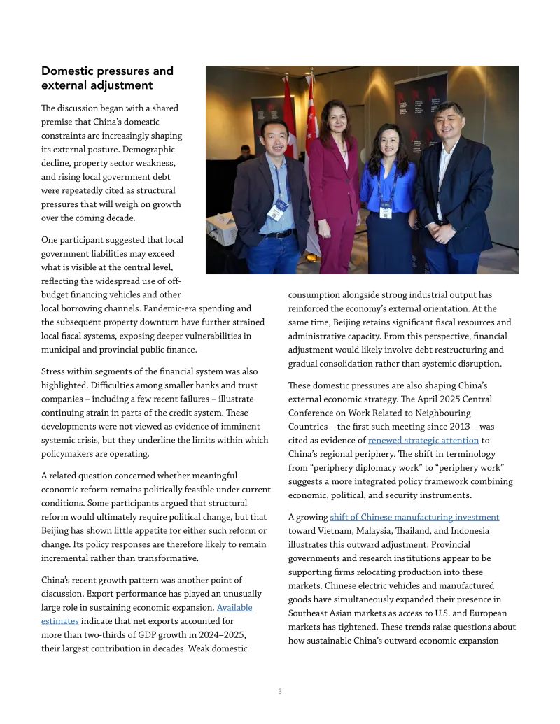 A related question concerned whether meaningful economic reform remains politically feasible under current conditions. Some participants argued that structural reform would ultimately require political change, but that Beijing has shown little appetite for either such reform or change. Its policy responses are therefore likely to remain incremental rather than transformative.