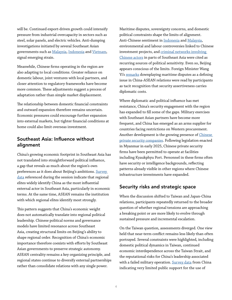 Three themes emerged during the exchange. First, China’s regional posture appears shaped less by a single trajectory of expansion or decline than by continued adjustment to domestic pressures. Second, Southeast Asian states are managing China’s growing influence through diversification and strategic autonomy rather than exclusive alignment. Third, regional tensions are more likely to accumulate gradually than unfold through a decisive rupture. Together these dynamics point to a fluid regional environment in which competition, hedging, and cooperation coexist.