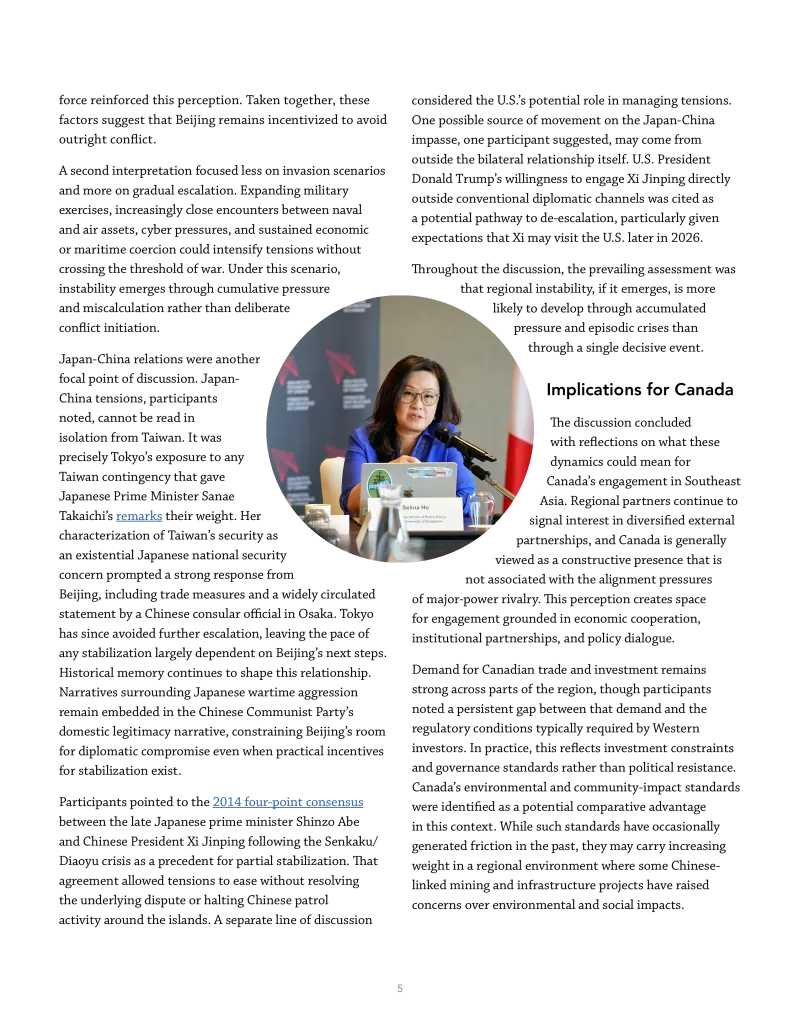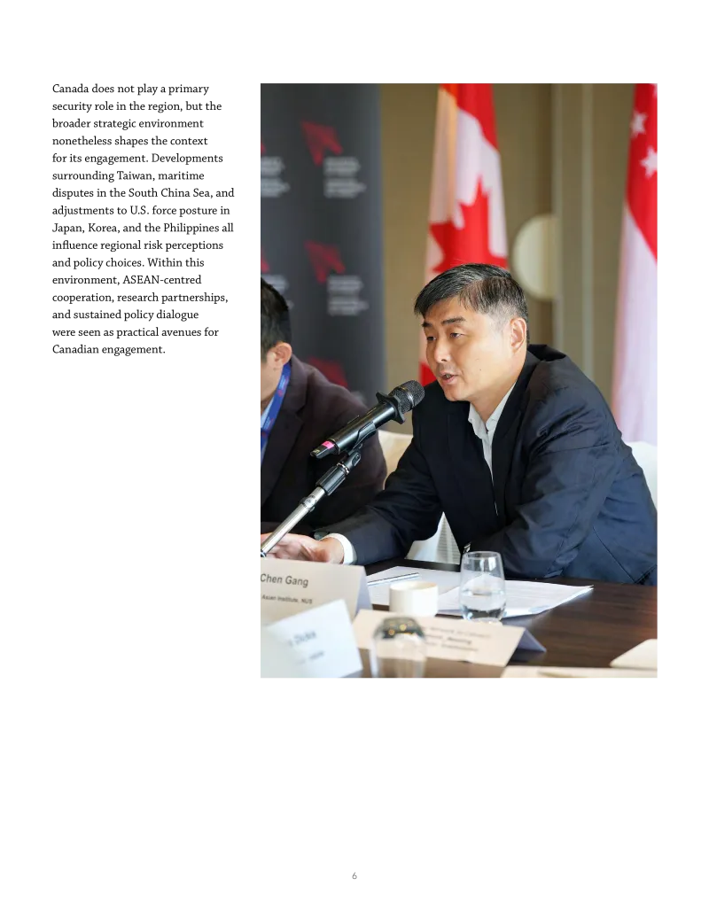 Canada does not play a primary security role in the region, but the broader strategic environment nonetheless shapes the context for its engagement. Developments surrounding Taiwan, maritime disputes in the South China Sea, and adjustments to U.S. force posture in Japan, Korea, and the Philippines all influence regional risk perceptions and policy choices. Within this environment, ASEAN-centred cooperation, research partnerships, and sustained policy dialogue were seen as practical avenues for Canadian engagement.