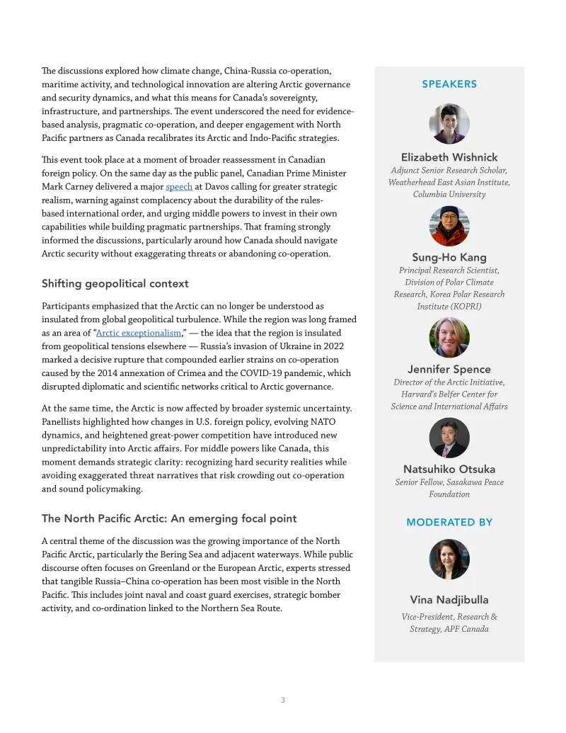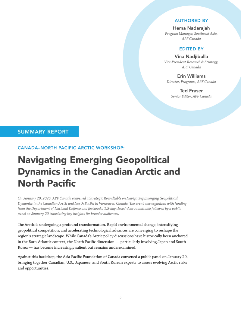 On January 20, 2026, APF Canada convened a Strategic Roundtable on Navigating Emerging Geopolitical Dynamics in the Canadian Arctic and North Pacific in Vancouver, Canada. The event was organized with funding from the Department of National Defence and featured a 1.5 day closed-door roundtable followed by a public panel on January 20 translating key insights for broader audiences.