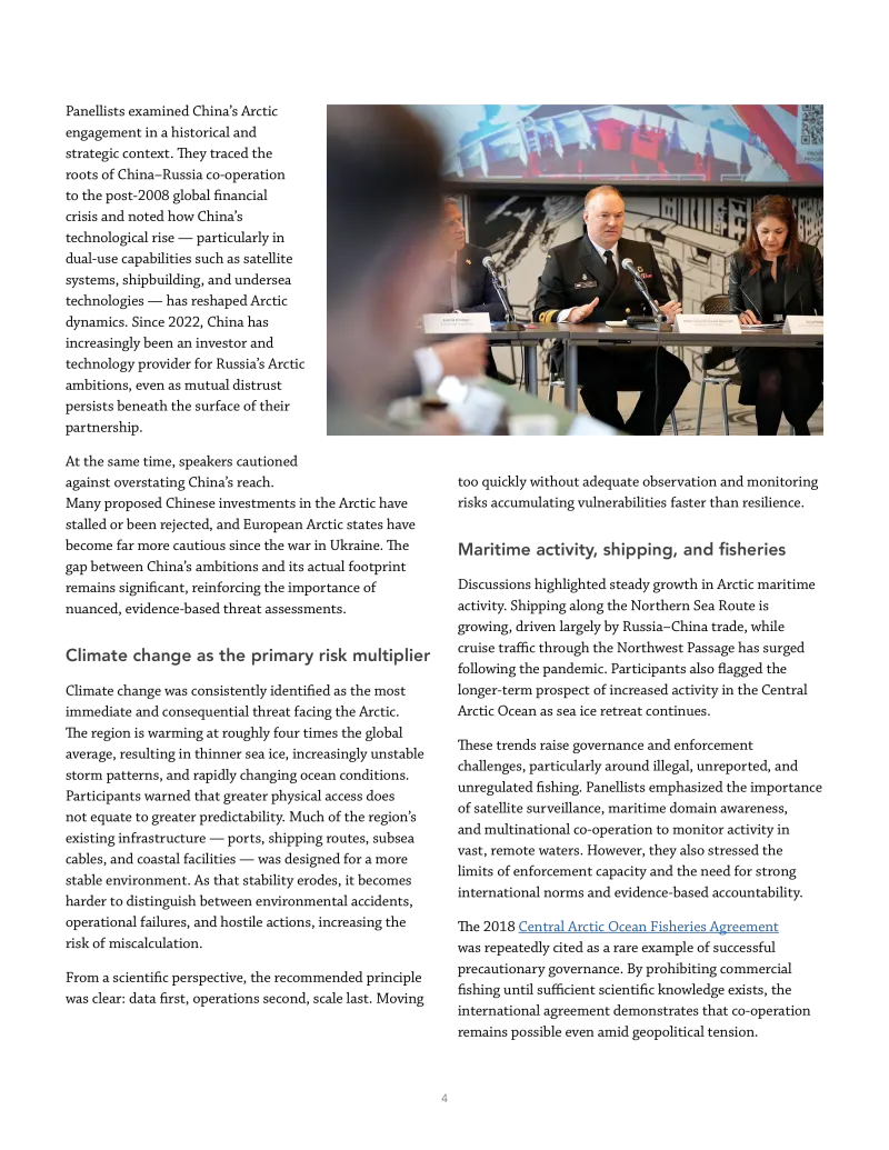 Panellists pointed to growing opportunities for co-operation on maritime domain awareness, search and rescue, environmental monitoring, and infrastructure resilience. Examples such as joint coast guard patrols and scientific collaboration aboard icebreakers illustrated how practical co-operation is already taking place and could be scaled further.